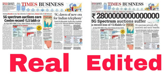 ਅਸਲ ਖ਼ਬਰ ਟਾਈਮਜ਼ ਆਫ਼ ਇੰਡੀਆ ਦੀ ਵੈੱਬਸਾਈਟ ਤੇ ਵੀ 2 ਅਗਸਤ 2022 ਨੂੰ ਪ੍ਰਕਾਸ਼ਿਤ ਹੋਈ ਹੈ। ਇਸ ਵਿਚ ਵਾਇਰਲ ਦਾਅਵੇ ਤੋਂ ਉਲਟ 5ਜੀ ਸਪੈਕਟਰਮ ਦੀ ਨਿਲਾਮੀ ਵਿੱਚ ਸਰਕਾਰੀ ਖ਼ਜ਼ਾਨੇ ਵਿੱਚ 1.5 ਲੱਖ ਕਰੋੜ ਰੁਪਏ ਦੀ ਆਮਦਨੀ ਦੀ ਗੱਲ ਲਿਖੀ ਗਈ ਹੈ। ਇਸ ਖ਼ਬਰ ਵਿੱਚ ਬਾਈਲਾਈਨ ਪੰਕਜ ਡੋਵਾਲ ਦੀ ਹੈ। ਹੁਣ ਅਸੀਂ ਪੱਤਰਕਾਰ ਪੰਕਜ ਡੋਵਾਲ ਦੇ ਟਵਿਟਰ ਅਕਾਊਂਟ ਨੂੰ ਸਰਚ ਕੀਤਾ ਜਿੱਥੇ ਉਨ੍ਹਾਂ ਨੇ ਟਵਿੱਟਰ ਹੈਂਡਲ ਤੇ 2 ਅਗਸਤ 2022 ਨੂੰ ਕਿਤੇ ਆਪਣੇ ਟਵੀਟ ਵਿੱਚ ਅਖ਼ਬਾਰ ਦੀ ਕਟਿੰਗ ਨੂੰ ਸ਼ੇਅਰ ਕੀਤਾ ਹੈ ਜਿਸ ਨੂੰ ਐਡਿਟ ਕਰ ਗ਼ਲਤ ਜਾਣਕਾਰੀ ਨਾਲ ਸ਼ੇਅਰ ਕੀਤਾ ਜਾ ਰਿਹਾ ਹੈ।