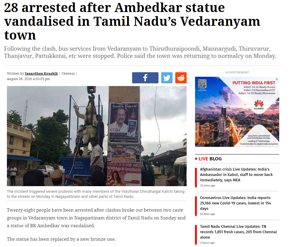 ਰਿਪੋਰਟ ਦੇ ਮੁਤਾਬਕ ਤਾਮਿਲ ਨਾਡੂ ਦੇ ਨਾਗਾਪਟਨਮ ਜ਼ਿਲ੍ਹੇ ਦੇ ਵਿੱਚ ਦੋ ਸਮੂਹਾਂ ਦੇ ਵਿੱਚ ਆਪਸੀ ਸੰਘਰਸ਼ ਤੋਂ ਬਾਅਦ ਡਾ ਭੀਮ ਰਾਓ ਅੰਬੇਦਕਰ ਦੀ ਮੂਰਤੀ ਨੂੰ ਨੁਕਸਾਨ ਪਹੁੰਚਾਇਆ ਗਿਆ। ਇੰਡੀਅਨ ਐਕਸਪ੍ਰੈਸ ਦੀ ਰਿਪੋਰਟ ਦੇ ਮੁਤਾਬਕ ਸਥਾਈ ਰੂਪ ਤੋਂ ਪੰਡਿਤ ਬਰਾਦਰੀ ਦੀ ਇੱਕ ਵਿਅਕਤੀ ਦੀ ਕਾਰ ਨਹੀਂ ਬੱਸ ਸਟੈਂਡ ਦੇ ਕੋਲ ਦੂਜੇ ਬਰਾਦਰੀ ਦੀ ਵਿਅਕਤੀ ਰਾਮਚੰਦਰਨ ਨੂੰ ਟੱਕਰ ਮਾਰ ਦਿੱਤੀ। ਘਟਨਾ ਤੋਂ ਬਾਅਦ ਆਰੋਪੀ ਉੱਥੋਂ ਫ਼ਰਾਰ ਹੋ ਗਿਆ ਪਰ ਭੀੜ ਨੇ ਉਸ ਦੀ ਕਾਰ ਨੂੰ ਅੱਗ ਲਗਾ ਦਿੱਤੀ ਜਿਸ ਤੋਂ ਬਾਅਦ ਗੁੱਸੇ ਵਿੱਚ ਆਏ ਪੰਡਿਤ ਬਰਾਦਰੀ ਦੇ ਸਮਰਥਕਾਂ ਨੇ ਡਾ. ਬੀ.ਆਰ ਅੰਬੇਦਕਰ ਦੀ ਮੂਰਤੀ ਨੂੰ ਨੁਕਸਾਨ ਪਹੁੰਚਾਇਆ।