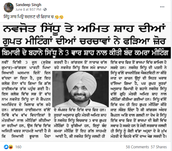 ਸੋਸ਼ਲ ਮੀਡੀਆ ਤੇ ਵਾਇਰਲ ਹੋ ਰਹੀ ਅਖ਼ਬਾਰ ਦੀ ਕਟਿੰਗ ਦੇ ਮੁਤਾਬਕ ਦੇਸ਼ ਦੇ ਗ੍ਰਹਿ ਮੰਤਰੀ ਅਮਿਤ ਸ਼ਾਹ ਅਤੇ ਕਾਂਗਰਸੀ ਵਿਧਾਇਕ ਨਵਜੋਤ ਸਿੰਘ ਸਿੱਧੂ ਦੇ ਵਿਚਕਾਰ ਗੁਪਤ ਮੀਟਿੰਗ ਹੋਈ।