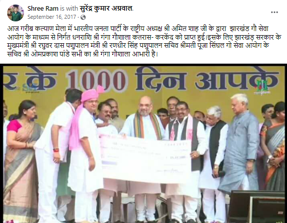 ਇਸ ਤੋਂ ਇਲਾਵਾ ਅਸੀਂ ਫੇਸਬੁੱਕ ‘ਤੇ ‘ਅਮਿਤ ਸ਼ਾਹ ਪੂਜਾ ਸਿੰਘਲ’ ਕੀਵਰਡ ਦੀ ਮਦਦ ਨਾਲ ਖੋਜ ਕੀਤੀ। ਸਰਚ ਦੇ ਦੌਰਾਨ ਸਾਨੂੰ 16 ਸਤੰਬਰ 2017 ਨੂੰ ਫੇਸਬੁੱਕ ਯੂਜ਼ਰ ਸ਼੍ਰੀ ਰਾਮ ਦੁਆਰਾ ਸਾਂਝਾ ਕੀਤਾ ਗਿਆ ਇੱਕ ਪੋਸਟ ਮਿਲਿਆ। ਪੋਸਟ ਦੇ ਨਾਲ ਇੱਕ ਤਸਵੀਰ ਲਗਾਈ ਗਈ ਹੈ, ਜਿਸ ਵਿੱਚ ਅਮਿਤ ਸ਼ਾਹ ਸਟੇਜ ‘ਤੇ ਨਜ਼ਰ ਆ ਰਹੇ ਹਨ। ਪੋਸਟ ਵਿੱਚ ਲਿਖੇ ਕੈਪਸ਼ਨ ਦੇ ਅਨੁਸਾਰ, ‘ਅੱਜ ਗਰੀਬ ਕਲਿਆਣ ਮੇਲੇ ਵਿੱਚ ਭਾਰਤੀ ਜਨਤਾ ਪਾਰਟੀ ਦੇ ਪ੍ਰਧਾਨ ਅਮਿਤ ਸ਼ਾਹ ਦੇ ਦੁਆਰਾ ਝਾਰਖੰਡ ਗਊ ਸੇਵਾ ਅਯੋਗ ਦੇ ਮਾਧਿਅਮ ਰਾਹੀਂ ਫੰਡ ਸ੍ਰੀ ਗੰਗਾ ਗਊਸ਼ਾਲਾ ਕਟਰਸ-ਕਰਕੰਦ ਨੂੰ ਮਿਲਿਆ।’ ਇਸ ਦੇ ਲਈ ਝਾਰਖੰਡ ਸਰਕਾਰ ਦੇ ਮੁੱਖ ਮੰਤਰੀ ਸ਼੍ਰੀ ਰਘੁਵਰ ਦਾਸ, ਪਸ਼ੂ ਪਾਲਣ ਮੰਤਰੀ ਰਣਧੀਰ ਸਿੰਘ, ਪਸ਼ੂ ਪਾਲਣ ਵਿਭਾਗ ਦੀ ਸਕੱਤਰ ਪੂਜਾ ਸਿੰਘਲ ਅਤੇ ਗਊ ਸੇਵਾ ਆਯੋਗ ਦੇ ਸਕੱਤਰ ਸ਼੍ਰੀ ਓਮਪ੍ਰਕਾਸ਼ ਪਾਂਡੇ ਸਾਰੇ ਸ਼੍ਰੀ ਗੰਗਾ ਜੀ ਦੇ ਧੰਨਵਾਦੀ ਹਨ। ਗਊਸ਼ਾਲਾ।