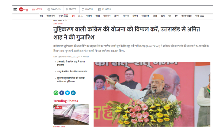 ਇਸ ਦੌਰਾਨ ਸਾਨੂੰ ਜ਼ੀ ਨਿਊਜ਼ ਦੁਆਰਾ 12 ਫਰਵਰੀ 2022 ਨੂੰ ਪ੍ਰਕਾਸ਼ਿਤ ਇਕ ਰਿਪੋਰਟ ਮਿਲੀ ਜਿਸ ਦੇ ਮੁਤਾਬਕ ਕੇਂਦਰੀ ਗ੍ਰਹਿ ਮੰਤਰੀ ਅਮਿਤ ਸ਼ਾਹ ਨੇ 12 ਫ਼ਰਵਰੀ 2022 ਨੂੰ ਉੱਤਰਾਖੰਡ ਵਿਖੇ ਇਕ ਜਨਸਭਾ ਨੂੰ ਸੰਬੋਧਨ ਕੀਤਾ ਸੀ।