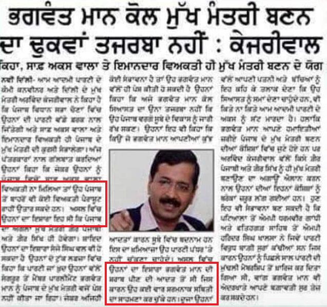 2022 ਵਿੱਚ ਹੋਣ ਜਾ ਰਹੀਆਂ ਪੰਜਾਬ ਵਿਧਾਨ ਸਭਾ ਚੋਣਾਂ ਨੂੰ ਲੈ ਕੇ ਹਰੇਕ ਪਾਰਟੀ ਨੇ ਆਪਣੀਆਂ ਤਿਆਰੀਆਂ ਸ਼ੁਰੂ ਕਰ ਦਿੱਤੀਆਂ ਹਨ। ਪਾਰਟੀ ਦੇ ਵਰਕਰਾਂ ਅਤੇ ਅਹੁਦੇਦਾਰਾਂ ਦੇ ਵੱਲੋਂ ਸੋਸ਼ਲ ਮੀਡੀਆ ਤੇ ਤਸਵੀਰਾਂ ਵੀਡੀਓ ਅਤੇ ਸੰਦੇਸ਼ ਖੂਬ ਸ਼ੇਅਰ ਕੀਤੇ ਜਾ ਰਹੇ ਹਨ। ਹਾਲਾਂਕਿ ਇਸ ਦੌਰਾਨ ਕਈ ਤਰ੍ਹਾਂ ਦੀਆਂ ਗੁੰਮਰਾਹਕੁੰਨ ਤਸਵੀਰਾਂ ਅਤੇ ਵੀਡੀਓ ਨੂੰ ਵੀ ਸ਼ੇਅਰ ਕੀਤਾ ਜਾ ਰਿਹਾ ਹੈ। 2017 ਦੀਆਂ ਪੰਜਾਬ ਵਿਧਾਨ ਸਭਾ ਚੋਣਾਂ ਦੌਰਾਨ ਆਮ ਆਦਮੀ ਪਾਰਟੀ ਸਿਰਫ਼ 20 ਸੀਟਾਂ ਤੇ ਸਿਮਟ ਕੇ ਰਹਿ ਗਈ ਸੀ ਜਿਸ ਦਾ ਇੱਕ ਮੁੱਖ ਕਾਰਨ ਮੁੱਖ ਮੰਤਰੀ ਦਾ ਚਿਹਰਾ ਨਾ ਹੋਣਾ ਵੀ ਸੀ। ਕੁਝ ਮੀਡਿਆ ਰਿਪੋਰਟਾਂ ਦੇ ਮੁਤਾਬਕ, ਮੁੱਖ ਮੰਤਰੀ ਦੇ ਨਾਮ ਵਜੋਂ ਨਾ ਐਲਾਨੇ ਜਾਣ ਕਰਕੇ ਭਗਵੰਤ ਮਾਨ ਪਾਰਟੀ ਤੋਂ ਨਾਰਾਜ਼ ਚੱਲ ਰਹੇ ਹਨ।