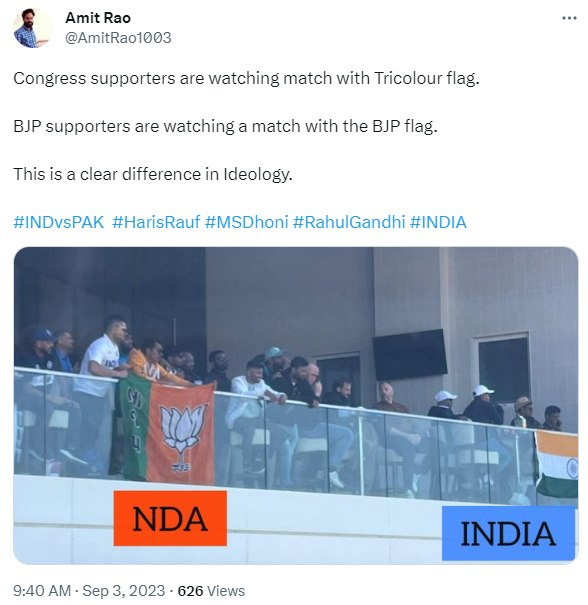 ਵਾਇਰਲ ਤਸਵੀਰ ਨੂੰ ਸ਼ੇਅਰ ਕਰਦੇ ਹੋਏ ਅਮਿਤ ਰਾਓ ਨੇ ਲਿਖਿਆ, “ਕਾਂਗਰਸ ਸਮਰਥਕ ਤਿਰੰਗੇ ਝੰਡੇ ਨਾਲ ਮੈਚ ਦੇਖ ਰਹੇ ਹਨ। ਭਾਜਪਾ ਸਮਰਥਕ ਭਾਜਪਾ ਦੇ ਝੰਡੇ ਨਾਲ ਮੈਚ ਦੇਖ ਰਹੇ ਹਨ। ਇਹ ਵਿਚਾਰਧਾਰਾ ਦਾ ਅੰਤਰ ਹੈ।”