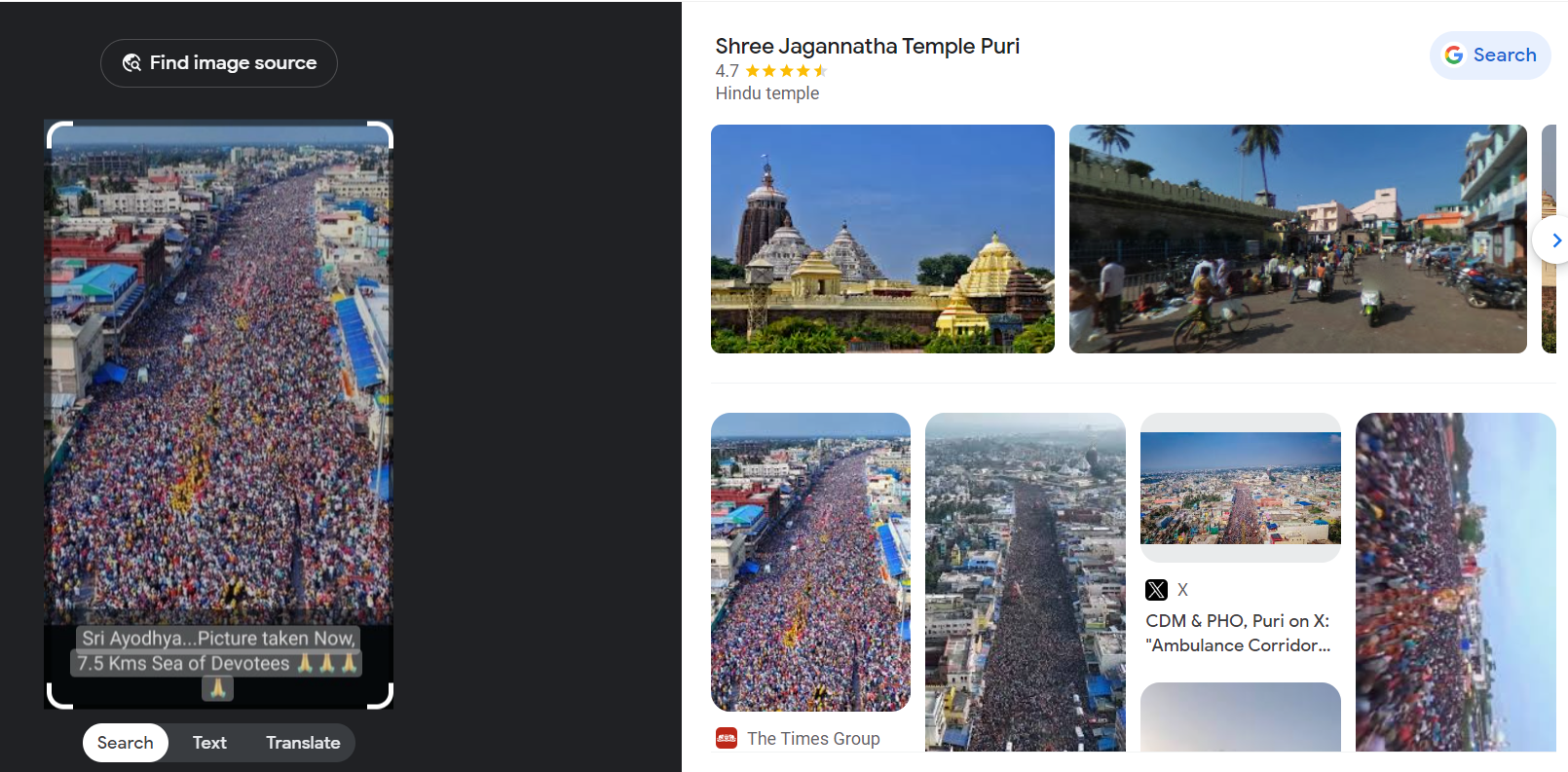 ਐਨਡੀਟੀਵੀ ਇੰਡੀਆ ਦੁਆਰਾ ਪ੍ਰਕਾਸ਼ਿਤ ਵੈਬ ਸਟੋਰੀ ਵਿੱਚ ਦੱਸਿਆ ਗਿਆ ਹੈ ਕਿ ਇਹ ਤਸਵੀਰ ਭਗਵਾਨ ਜਗਨਨਾਥ ਰਥ ਯਾਤਰਾ ਦੀ ਹੈ। ਉਸ ਸਮੇਂ, ਉੜੀਸਾ ਵਿੱਚ ਭਗਵਾਨ ਜਗਨਨਾਥ ਦੀ ਸਾਲਾਨਾ ਯਾਤਰਾ ਲਈ ਸ਼ਰਧਾਲੂਆਂ ਦੀ ਭਾਰੀ ਭੀੜ ਇਕੱਠੀ ਹੋਈ ਸੀ। ਭਗਵਾਨ ਜਗਨਨਾਥ ਦੀ ਵਿਸ਼ਾਲ ਰੱਥ ਯਾਤਰਾ ਸਬੰਧੀ ਜਾਗਰਣ ਵੱਲੋਂ ਪ੍ਰਕਾਸ਼ਿਤ ਰਿਪੋਰਟ ਵਿੱਚ ਪੜ੍ਹੀ ਜਾ ਸਕਦੀ ਹੈ । ਇਹ ਰਿਪੋਰਟ 4 ਜੂਨ 2023 ਨੂੰ ਪ੍ਰਕਾਸ਼ਿਤ ਕੀਤੀ ਗਈ ਸੀ।
