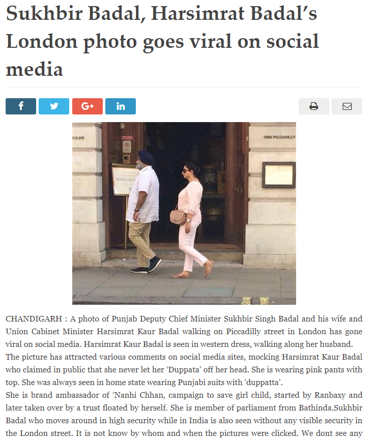 ਰਿਪੋਰਟ ਮੁਤਾਬਕ ਪੰਜਾਬ ਦੇ ਉਸ ਵੇਲੇ ਦੇ ਉਪ ਮੁੱਖ ਮੰਤਰੀ ਸੁਖਬੀਰ ਸਿੰਘ ਬਾਦਲ ਅਤੇ ਉਨ੍ਹਾਂ ਦੀ ਪਤਨੀ ਤੇ ਕੇਂਦਰੀ ਕੈਬਨਿਟ ਮੰਤਰੀ ਹਰਸਿਮਰਤ ਕੌਰ ਬਾਦਲ ਦੀ ਲੰਡਨ ਦੀ ਪਿਕਾਡਲੀ ਸਟਰੀਟ ‘ਤੇ ਸੈਰ ਕਰਦੇ ਹੋਏ ਦੀ ਤਸਵੀਰ ਸੋਸ਼ਲ ਮੀਡੀਆ ‘ਤੇ ਵਾਇਰਲ ਹੋ ਗਈ। ਰਿਪੋਰਟ ਮੁਤਾਬਕ ਹਰਸਿਮਰਤ ਕੌਰ ਬਾਦਲ ਪੱਛਮੀ ਪਹਿਰਾਵੇ ਵਿੱਚ ਆਪਣੇ ਪਤੀ ਦੇ ਨਾਲ ਘੁੰਮਦੇ ਨਜ਼ਰ ਆਏ।