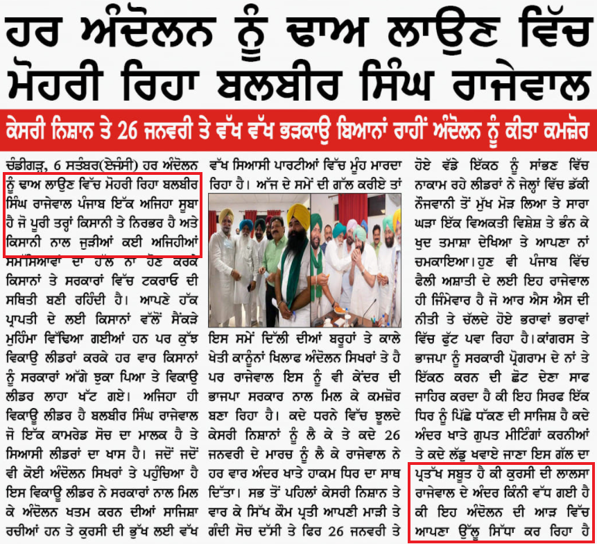 ਇਸ ਦੌਰਾਨ ਸੋਸ਼ਲ ਮੀਡੀਆ ਤੇ ਇੱਕ ਅਖ਼ਬਾਰ ਦੀ ਕਲੀਪਿੰਗ ਵਾਇਰਲ ਹੋ ਰਹੀ ਜਿਸ ਦੀ ਹੈਡਲਾਈਨ ਮੁਤਾਬਕ ਕਿਸਾਨ ਨੇਤਾ ਬਲਬੀਰ ਸਿੰਘ ਰਾਜੇਵਾਲ (Balbir Singh Rajewal) ਅੰਦੋਲਨ ਨੂੰ ਢਾਅ ਲਾਉਣ ਵਿੱਚ ਮੋਹਰੀ ਰਿਹਾ।
