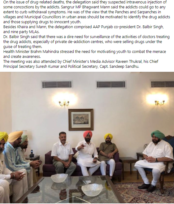 ਅੱਗੇ ਵੱਧਦੇ ਹੋਏ ਅਸੀਂ ਫੇਸਬੁੱਕ ਤੇ ਕੁਝ ਕੀ ਵਰਡ ਦੀ ਮੱਦਦ ਨਾਲ ਵਾਇਰਲ ਹੋ ਰਹੀ ਤਸਵੀਰ ਨੂੰ ਖੰਗਾਲਿਆ ਸਰਚ ਦੌਰਾਨ ਸਾਨੂੰ ਵਾਇਰਲ ਹੋ ਰਹੀ ਤਸਵੀਰ ਪੰਜਾਬ ਦੇ ਮੁੱਖ ਮੰਤਰੀ ਕੈਪਟਨ ਅਮਰਿੰਦਰ ਸਿੰਘ ਦੇ ਮੀਡੀਆ ਸਲਾਹਕਾਰ ਰਵੀਨ ਠੁਕਰਾਲ ਦੁਆਰਾ ਜੁਲਾਈ 3, 2018 ਨੂੰ ਅਪਲੋਡ ਮਿਲੀ।ਰਵੀਨ ਠੁਕਰਾਲ ਦੁਆਰਾ ਅਪਲੋਡ ਕੀਤੀ ਗਈ ਇਨ੍ਹਾਂ ਤਸਵੀਰਾਂ ਦੇ ਮੁਤਾਬਕ ਵੀ ਆਮ ਆਦਮੀ ਪਾਰਟੀ ਦਾ ਇੱਕ ਵਫਦ ਮੁੱਖ ਮੰਤਰੀ ਕੈਪਟਨ ਅਮਰਿੰਦਰ ਸਿੰਘ ਨਾਲ ਨਸ਼ੇ ਦੇ ਮੁੱਦੇ ਤੇ ਮੁਲਾਕਾਤ ਕਰਨ ਲਈ ਪਹੁੰਚਿਆ।