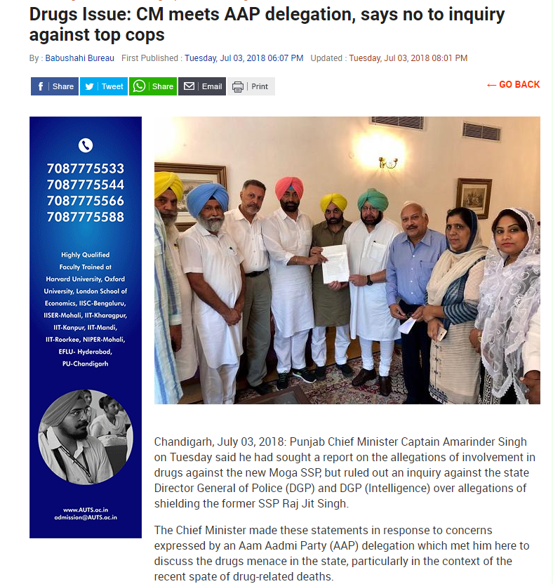 ਆਪਣੀ ਜਾਂਚ ਨੂੰ ਅੱਗੇ ਵਧਾਉਂਦੇ ਹੋਇਆ ਸੀ ਵਾਇਰਲ ਤਸਵੀਰ ਨੂੰ ਗੂਗਲ ਰਿਵਰਸ ਇਮੇਜ ਸਰਚ ਦੀ ਮੱਦਦ ਨਾਲ ਖੰਗਾਲਿਆ ਸਰਦ ਦੌਰਾਨ ਸਾਨੂੰ ਵਾਇਰਲ ਤਸਵੀਰ ਨਾਲ ਮੇਲ ਖਾਂਦੀ ਇਕ ਤਸਵੀਰ ਬਾਬੂਸ਼ਾਹੀ ਦੁਆਰਾ ਜੁਲਾਈ 3, 2018 ਨੂੰ ਇਕ ਆਰਟੀਕਲ ਵਿੱਚ ਪ੍ਰਕਾਸ਼ਿਤ ਮਿਲੀ। ਰਿਪੋਰਟ ਦੇ ਮੁਤਾਬਕ ਆਮ ਆਦਮੀ ਪਾਰਟੀ ਦਾ ਇੱਕ ਵਫਦ ਮੁੱਖ ਮੰਤਰੀ ਕੈਪਟਨ ਅਮਰਿੰਦਰ ਸਿੰਘ ਨਾਲ ਨਸ਼ੇ ਦੇ ਮੁੱਦੇ ਤੇ ਮੁਲਾਕਾਤ ਕਰਨ ਦੇ ਲਈ ਪਹੁੰਚਿਆ।