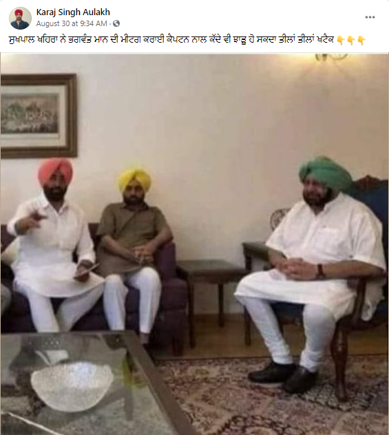 ਸੋਸ਼ਲ ਮੀਡੀਆ ਤੇ ਇਕ ਤਸਵੀਰ ਵਾਇਰਲ ਹੋ ਰਹੀ ਹੈ ਜਿਸ ਵਿੱਚ ਆਮ ਆਦਮੀ ਪਾਰਟੀ ਪੰਜਾਬ ਦੇ ਪ੍ਰਧਾਨ ਅਤੇ ਸੰਸਦ ਮੈਂਬਰ ਭਗਵੰਤ ਮਾਨ (Bhagwant Mann) ਨੂੰ ਪੰਜਾਬ ਦੇ ਮੁੱਖ ਮੰਤਰੀ ਕੈਪਟਨ ਅਮਰਿੰਦਰ ਸਿੰਘ ਦੇ ਨਾਲ ਬੈਠਿਆਂ ਦੇਖਿਆ ਜਾ ਸਕਦਾ ਹੈ। ਵਾਇਰਲ ਹੋ ਰਹੀ ਤਸਵੀਰ ਦੇ ਨਾਲ ਦਾਅਵਾ ਕੀਤਾ ਜਾ ਰਿਹਾ ਹੈ ਕਿ ਸਾਬਕਾ ਵਿਰੋਧੀ ਧਿਰ ਦੇ ਨੇਤਾ ਅਤੇ ਮੌਜੂਦਾ ਕਾਂਗਰਸੀ ਵਿਧਾਇਕ ਸੁਖਪਾਲ ਸਿੰਘ ਖਹਿਰਾ ਨੇ ਭਗਵੰਤ ਮਾਨ ਦੀ ਪੰਜਾਬ ਦੇ ਮੁੱਖ ਮੰਤਰੀ ਕੈਪਟਨ ਅਮਰਿੰਦਰ ਸਿੰਘ ਨਾਲ ਮੁਲਾਕਾਤ ਕਰਵਾਈ।