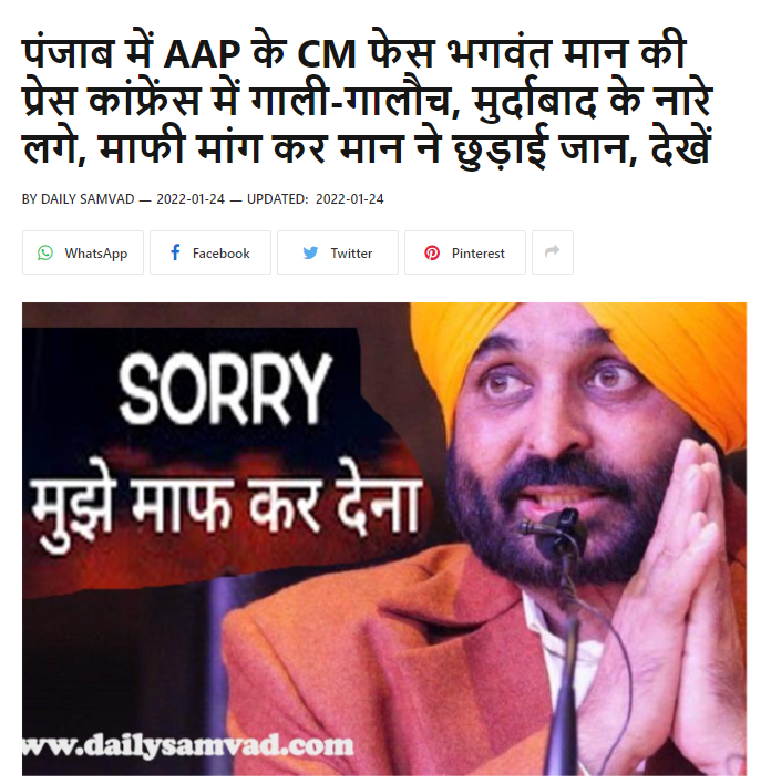 ਪੜਤਾਲ ਨੂੰ ਅੱਗੇ ਵਧਾਉਂਦੇ ਹੋਏ ਅਸੀਂ ਗੂਗਲ ਤੇ ਕੁਝ ਕੀ ਵਰਡ ਦੇ ਜਰੀਏ ਸਰਚ ਕੀਤਾ। ਸਰਚ ਦੇ ਦੌਰਾਨ ਸਾਨੂੰ ‘ਡੇਲੀ ਸੰਵਾਦ’ ਦੁਆਰਾ ਪ੍ਰਕਾਸ਼ਿਤ ਆਰਟੀਕਲ ਮਿਲਿਆ। ਆਰਟੀਕਲ ਮੁਤਾਬਕ ਪੰਜਾਬ ‘ਚ ਆਮ ਆਦਮੀ ਪਾਰਟੀ ਦੇ ਮੁੱਖ ਮੰਤਰੀ ਅਹੁਦੇ ਦੇ ਉਮੀਦਵਾਰ ਭਗਵੰਤ ਮਾਨ ਦਾ ਜਲੰਧਰ ‘ਚ ਜ਼ਬਰਦਸਤ ਵਿਰੋਧ ਹੋਇਆ। ਭਗਵੰਤ ਮਾਨ ਦੀ ਪ੍ਰੈੱਸ ਕਾਨਫਰੰਸ ‘ਚ ਕਾਫੀ ਗਾਲੀ-ਗਲੋਚ ਵੀ ਹੋਈ, ਜਿਸ ਦੌਰਾਨ ਆਮ ਆਦਮੀ ਪਾਰਟੀ, ਰਾਘਵ ਚੱਢਾ ਅਤੇ ਅਰਵਿੰਦ ਕੇਜਰੀਵਾਲ ਖਿਲਾਫ ਜੰਮ ਕੇ ਨਾਅਰੇਬਾਜ਼ੀ ਕੀਤੀ ਗਈ। ਮਾਮਲਾ ਵਧਦਾ ਦੇਖ ਭਗਵੰਤ ਮਾਨ ਨੇ ਮੁਆਫੀ ਮੰਗ ਕੇ ਖਹਿੜਾ ਛੁਡਵਾਇਆ।