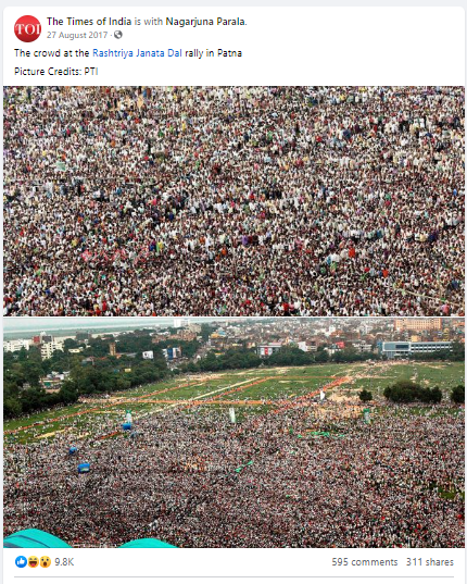 ਇਸ ਦਾਅਵੇ ਦੀ ਪੁਸ਼ਟੀ ਕਰਨ ਲਈ ਅਸੀਂ ਤਸਵੀਰਾਂ ਦੀ ਗੂਗਲ ਰਿਵਰਸ ਇਮੇਜ ਦੀ ਮਦਦ ਨਾਲ ਸਰਚ ਕੀਤੀ। ਸਰਚ ਦੌਰਾਨ ਸਾਨੂੰ ਟਾਈਮਜ਼ ਆਫ ਇੰਡੀਆ ਦੇ ਫੇਸਬੁੱਕ ਪੇਜ ਦੁਆਰਾ 27 ਅਗਸਤ, 2017 ਨੂੰ ਸ਼ੇਅਰ ਕੀਤੀ ਗਈ ਇੱਕ ਫੇਸਬੁੱਕ ਪੋਸਟ ਵਿੱਚ ਹੁਬੂਹੁ ਤਸਵੀਰਾਂ ਮਿਲੀਆਂ। ਟਾਈਮਜ਼ ਆਫ ਇੰਡੀਆ ਵੱਲੋਂ ਸ਼ੇਅਰ ਕੀਤੀ ਗਈ ਫੇਸਬੁੱਕ ਪੋਸਟ ਦੇ ਕੈਪਸ਼ਨ ਵਿੱਚ ਇਨ੍ਹਾਂ ਤਸਵੀਰਾਂ ਨੂੰ ਰਾਸ਼ਟਰੀ ਜਨਤਾ ਦਲ ਦੀ ਰੈਲੀ ਵਿੱਚ ਇਕੱਠੀ ਹੋਈ ਭੀੜ ਦਾ ਦੱਸਿਆ ਗਿਆ ਹੈ।
