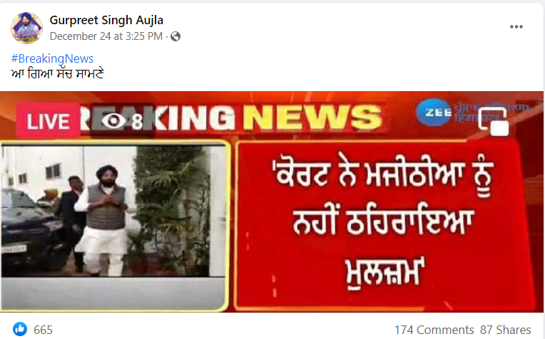 ਇਸ ਸਭ ਦੇ ਦੌਰਾਨ ਸੋਸ਼ਲ ਮੀਡੀਆ ‘ਤੇ ‘ਜੀ ਪੰਜਾਬ ਹਰਿਆਣਾ ਹਿਮਾਚਲ’ ਦੀ ਬ੍ਰੈਕਿੰਗ ਵਾਇਰਲ ਹੋ ਰਹੀ ਹੈ ਜਿਸ ਮੁਤਾਬਕ ਕੋਰਟ ਨੇ ਅਕਾਲੀ ਆਗੂ ਬਿਕਰਮ ਮਜੀਠੀਆ ਨੂੰ ਮੁਲਜ਼ਮ ਨਹੀਂ ਠਹਿਰਾਇਆ ਹੈ। ਬ੍ਰੈਕਿੰਗ ਪਲੇਟ ਨੂੰ ਵਾਇਰਲ ਕਰਦਿਆਂ ਇਹ ਦਾਅਵਾ ਕੀਤਾ ਜਾ ਰਿਹਾ ਹੈ ਕਿ ਬਿਕਰਮ ਸਿੰਘ ਮਜੀਠੀਆ ਨੂੰ ਕੋਰਟ ਦੁਆਰਾ ਰਾਹਤ ਦਿੱਤੀ ਗਈ ਹੈ।