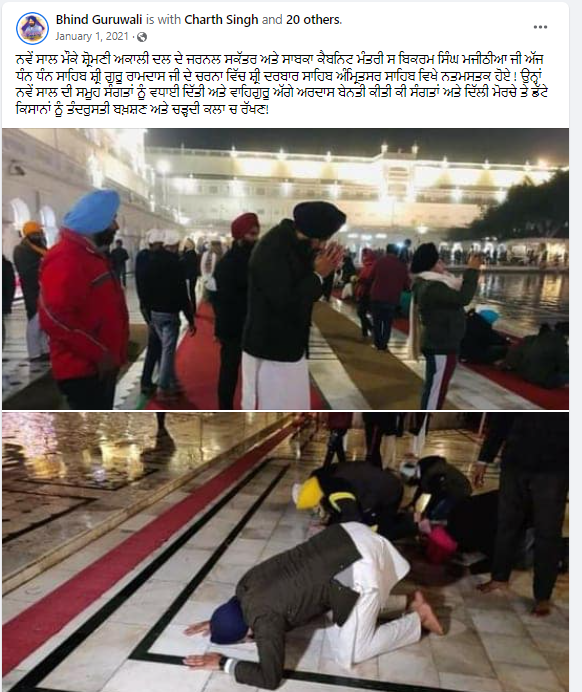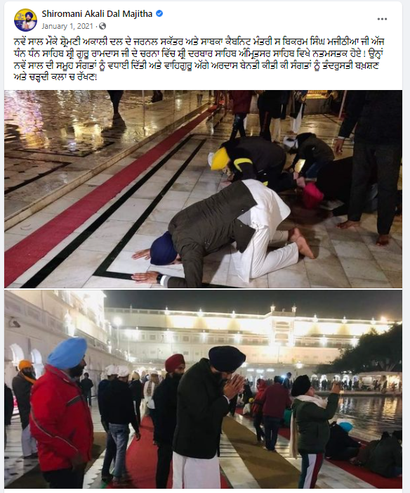ਇਸ ਸਭ ਦੇ ਦੌਰਾਨ ਸੋਸ਼ਲ ਮੀਡੀਆ ਤੇ ਕੁਝ ਤਸਵੀਰਾਂ ਵਾਇਰਲ ਹੋ ਰਹੀਆਂ ਹਨ ਜਿਸ ਵਿੱਚ ਬਿਕਰਮਜੀਤ ਸਿੰਘ ਮਜੀਠੀਆ ਨੂੰ ਮੱਥਾ ਟੇਕਦੀਆਂ ਦੇਖਿਆ ਜਾ ਸਕਦਾ ਹੈ। ਵਾਇਰਲ ਹੋ ਰਹੀ ਤਸਵੀਰਾਂ ਦੇ ਨਾਲ ਦਾਅਵਾ ਕੀਤਾ ਜਾ ਰਿਹਾ ਹੈ ਕਿ ਬਿਕਰਮਜੀਤ ਸਿੰਘ ਮਜੀਠੀਆ ਨਵੇਂ ਸਾਲ ਦੇ ਮੌਕੇ ਤੇ ਗੁਰੂ ਘਰ ਵਿਖੇ ਨਤਮਸਤਕ ਹੋਏ।
