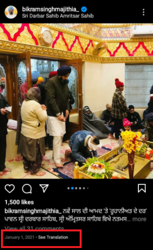 ਇਸ ਦੇ ਨਾਲ ਹੀ ਵਾਇਰਲ ਹੋ ਰਹੀ ਇੱਕ ਹੋਰ ਤਸਵੀਰ ਸਾਨੂੰ ਬਿਕਰਮਜੀਤ ਸਿੰਘ ਮਜੀਠੀਆ ਦੇ ਇੰਸਟਾਗ੍ਰਾਮ ਹੈਂਡਲ ਤੇ ਜਨਵਰੀ 1, 2021 ਨੂੰ ਅਪਲੋਡ ਮਿਲੀ। ਹਾਲਾਂਕਿ ਅਸੀਂ ਪਾਇਆ ਕਿ ਬਾਅਦ ਦੇ ਵਿਚ ਇਸ ਤਸਵੀਰ ਨੂੰ ਡਿਲੀਟ ਕਰ ਦਿੱਤਾ ਗਿਆ।