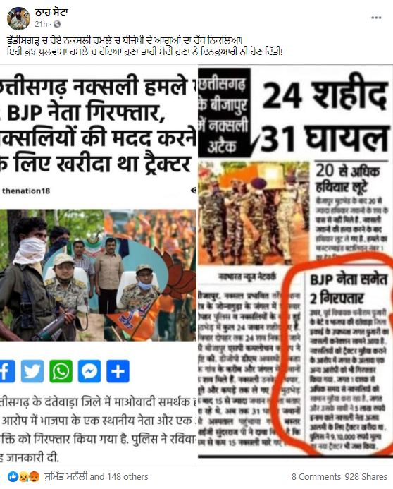 ਸੋਸ਼ਲ ਮੀਡੀਆ ਤੇ ਕਲਿਪਿੰਗ ਵਾਇਰਲ ਹੋ ਰਹੀ ਹੈ ਜਿਸ ਦੇ ਮੁਤਾਬਕ ਛੱਤੀਸਗੜ੍ਹ ‘ਚ ਹੋਏ ਨਕਸਲੀ ਹਮਲੇ ਦੇ ਮਾਮਲੇ ਵਿੱਚ ਬੀਜੇਪੀ ਲੀਡਰ ਸਮੇਤ ਦੋ ਵਿਅਕਤੀਆਂ ਨੂੰ ਗ੍ਰਿਫ਼ਤਾਰ ਕੀਤਾ ਗਿਆ ਹੈ। ਵਾਇਰਲ ਹੋ ਰਹੀ ਕਲਿਪਿੰਗ ਵਿੱਚ ਦੋਨਾਂ ਆਰੋਪੀਆਂ ਦੀ ਤਸਵੀਰ ਵੀ ਦੇਖੀ ਜਾ ਸਕਦੀ ਹੈ।
