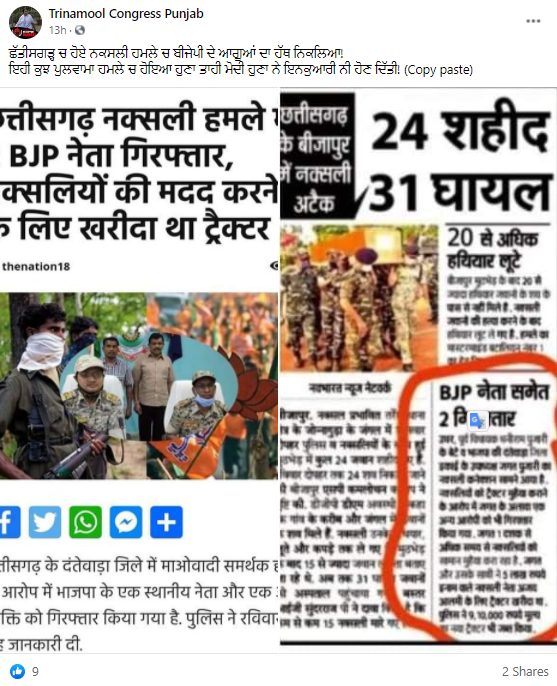 ਸੋਸ਼ਲ ਮੀਡੀਆ ਤੇ ਇਕ ਫੇਸਬੁੱਕ ਪੇਜ ਨੇ ਇਨ੍ਹਾਂ ਤਸਵੀਰਾਂ ਨੂੰ ਸ਼ੇਅਰ ਕਰਦੇ ਹੋਏ ਲਿਖਿਆ,”ਛੱਤੀਸਗੜ੍ਹ ਚ ਹੋਏ ਨਕਸਲੀ ਹਮਲੇ ਚ ਬੀਜੇਪੀ ਦੇ ਆਗੂਆਂ ਦਾ ਹੱਥ ਨਿਕਲਿਆ। ਇਹੀ ਕੁਝ ਪੁਲਵਾਮਾ ਹਮਲੇ ਚ ਹੋਇਆ ਹੁਣਾ ਤਾਹੀ ਮੋਦੀ ਹੁਣਾ ਨੇ ਇਨਕੁਆਰੀ ਨੀ ਹੋਣ ਦਿੱਤੀ।”