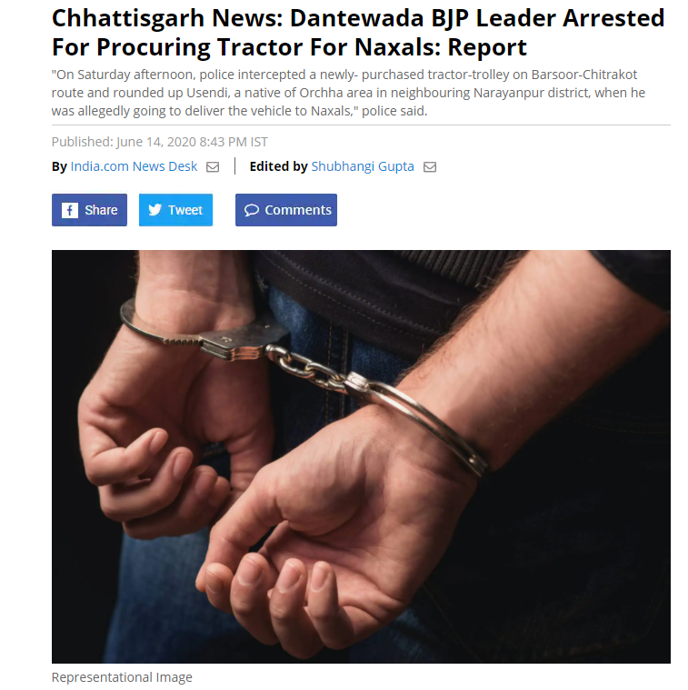 ਐਨਡੀਟੀਵੀ ਦੀ ਰਿਪੋਰਟ ਮੁਤਾਬਕ ਭਾਰਤੀ ਜਨਤਾ ਪਾਰਟੀ ਦੇ ਜ਼ਿਲ੍ਹਾ ਯੂਨਿਟ ਦੇ ਵਾਈਸ ਪ੍ਰਧਾਨ ਜਗਤ ਪੁਜਾਰੀ ਅਤੇ ਇਕ ਹੋਰ ਵਿਅਕਤੀ ਨੂੰ ਨਕਸਲੀਆਂ ਨੂੰ ਟਰੈਕਟਰ ਸਪਲਾਈ ਕਰਨ ਦੇ ਦੋਸ਼ ਹੇਠ ਗ੍ਰਿਫ਼ਤਾਰ ਕੀਤਾ ਗਿਆ ਹੈ।