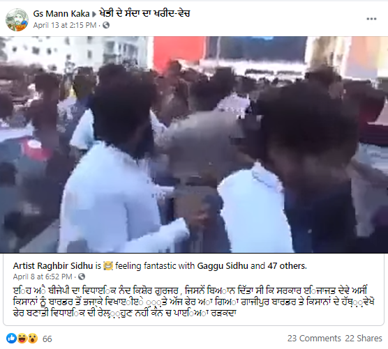 ਸੋਸ਼ਲ ਮੀਡੀਆ ਤੇ ਇਕ ਫੇਸਬੁੱਕ ਯੂਜ਼ਰ ਨੇ ਵੀਡੀਓ ਨੂੰ ਸ਼ੇਅਰ ਕਰਦਿਆਂ ਲਿਖਿਆ,”ਇਹ ਹੈ ਬੀਜੇਪੀ ਦਾ ਵਿਧਾਇਕ ਨੰਦ ਕਿਸ਼ੋਰ ਗੁਰਜਰ , ਜਿਸਨੇ ਬਿਆਨ ਦਿੱਤਾ ਸੀ ਕਿ ਸਰਕਾਰ ਇਜ਼ਾਜ਼ਤ ਦੇਵੇ ਅਸੀਂ ਕਿਸਾਨਾਂ ਨੂੰ ਬਾਰਡਰ ਤੋਂ ਭਜਾਵਾਂਗੇ ਤੇ ਅੱਜ ਫੇਰ ਆ ਗਿਆ ਗਾਜੀਪੁਰ ਬਾਰਡਰ ਤੇ ਕਿਸਾਨਾਂ ਦੇ ਹੱਥ ਵੇਖੋ ਫੇਰ ਬਣਾਤੀ ਵਿਧਾਇਕ ਦੀ ਰੇਲ, ਹੁਣ ਨਹੀਂ ਕੰਨ ਚ ਪਾਇਆ ਰੜਕਦਾ”।