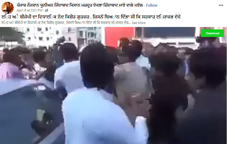ਸੋਸ਼ਲ ਮੀਡੀਆ ਤੇ ਵੀਡੀਓ ਵਾਇਰਲ ਹੋ ਰਹੀ ਹੈ ਜਿਸ ਵਿੱਚ ਭੀੜ ਨੂੰ ਪੁਲਿਸ ਦੇ ਸਾਹਮਣੇ ਇੱਕ ਵਿਅਕਤੀ ਨੂੰ ਕੁੱਟਦੇ ਹੋਏ ਦੇਖਿਆ ਜਾ ਸਕਦਾ ਹੈ। ਵੀਡੀਓ ਦੇ ਨਾਲ ਦਾਅਵਾ ਕੀਤਾ ਜਾ ਰਿਹਾ ਹੈ ਕਿ ਵੀਡੀਓ ਵਿੱਚ ਦਿਖਾਈ ਦੇ ਰਿਹਾ ਵਿਅਕਤੀ ਭਾਜਪਾ ਵਿਧਾਇਕ ਨੰਦ ਕਿਸੋਰ ਗੁਜ਼ਰ ਹੈ ਜਿਸ ਨਾਲ ਗਾਜ਼ੀਪੁਰ ਬਾਰਡਰ ਨੇੜੇ ਕਿਸਾਨਾਂ ਨੇ ਕੁੱਟਮਾਰ ਕੀਤੀ।