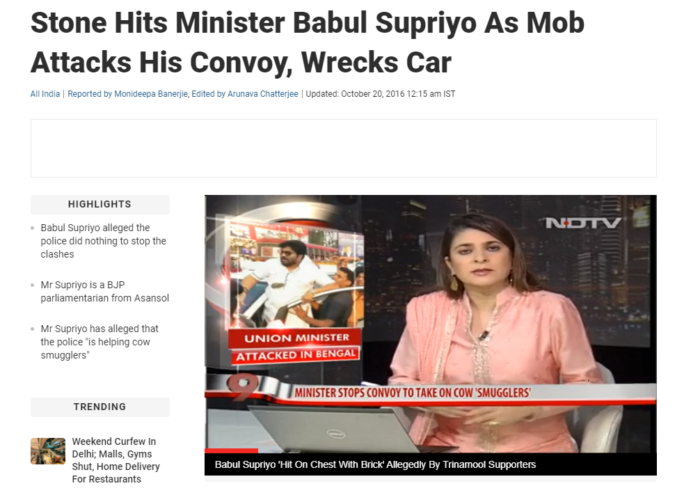 ਐਨਡੀਟੀਵੀ ਦੀ ਰਿਪੋਰਟ ਦੇ ਮੁਤਾਬਕ ਕੇਂਦਰੀ ਮੰਤਰੀ ਬਾਬੁਲ ਸੁਪਰੀਓ ਆਪਣੇ ਸੰਸਦ ਹਲਕੇ ਦੇ ਵਿੱਚ ਗਏ ਸਨ ਜਿੱਥੇ ਉਨ੍ਹਾਂ ਦੇ ਸੀਨੀਅਰ ਪਾਰਟੀ ਲੀਡਰ ਸੁਬਰਤਾ ਮਿਸ਼ਰਾ ਦੇ ਨਾਲ ਕੁੱਟਮਾਰ ਕੀਤੀ ਗਈ।