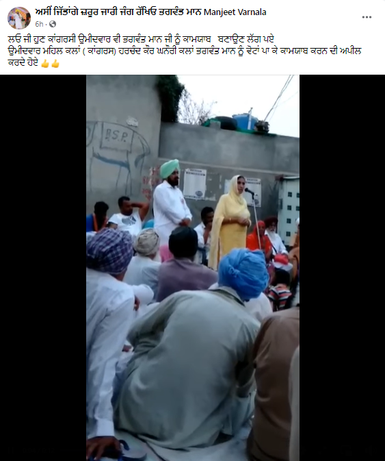 ਫੇਸਬੁੱਕ ਪੇਜ ‘ਅਸੀਂ ਜਿੱਤਾਂਗੇ ਜ਼ਰੂਰ’ ਨੇ ਵਾਇਰਲ ਹੋ ਰਹੀ ਵੀਡੀਓ ਨੂੰ ਸ਼ੇਅਰ ਕਰਦਿਆਂ ਲਿਖਿਆ,’ਲਓ ਜੀ ਹੁਣ ਕਾਂਗਰਸ ਉਮੀਦਵਾਰ ਵੀ ਭਗਵੰਤ ਮਾਨ ਨੂੰ ਕਾਮਯਾਬ ਬਣਾਉਣ ਲੱਗ ਪਏ।’ ਇਸ ਵੀਡੀਓ ਨੂੰ ਹੁਣ ਤਕ 16,000 ਤੋਂ ਵੱਧ ਯੂਜ਼ਰ ਦੇਖ ਚੁੱਕੇ ਹਨ।