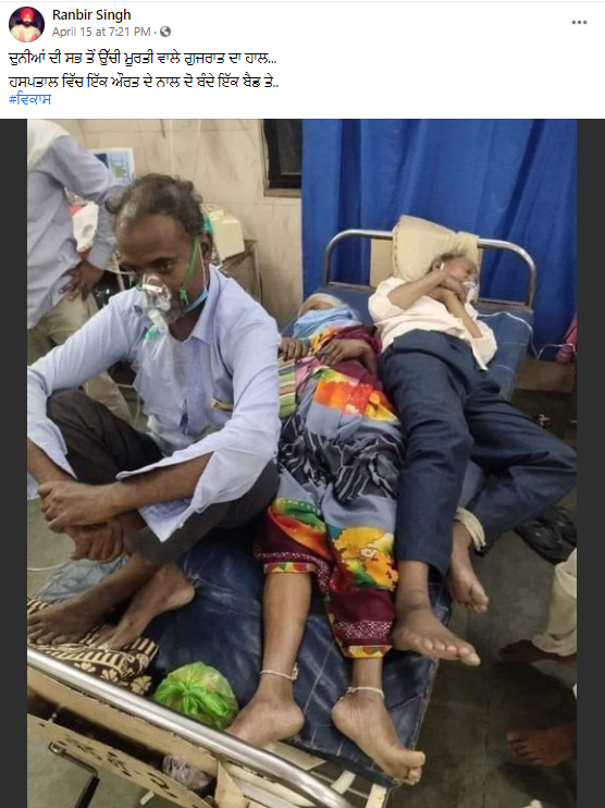 ਸੋਸ਼ਲ ਮੀਡੀਆ ਤੇ ਇੱਕ ਤਸਵੀਰ ਤੇਜ਼ੀ ਨਾਲ ਵਾਇਰਲ ਹੋ ਰਹੀ ਹੈ ਜਿਸ ਵਿੱਚ ਇੱਕ ਬੈੱਡ ਦੇ ਉੱਤੇ ਤਿੰਨ ਮਰੀਜ਼ਾਂ ਨੂੰ ਪਏ ਦੇਖਿਆ ਜਾ ਸਕਦਾ ਹੈ। ਤਸਵੀਰ ਦੇ ਨਾਲ ਦਾਅਵਾ ਕੀਤਾ ਜਾ ਰਿਹਾ ਹੈ ਕਿ ਇਹ ਤਸਵੀਰ ਗੁਜਰਾਤ ਦੇ ਹਸਪਤਾਲ ਦੀ ਹੈ ਜਿਥੇ ਕੋਰੋਨਾ ਵਾਇਰਸ ਕਾਰਨ ਮਰੀਜ਼ਾਂ ਨੂੰ ਬੈੱਡ ਨਹੀਂ ਮਿਲ ਰਹੇ ਹਨ।