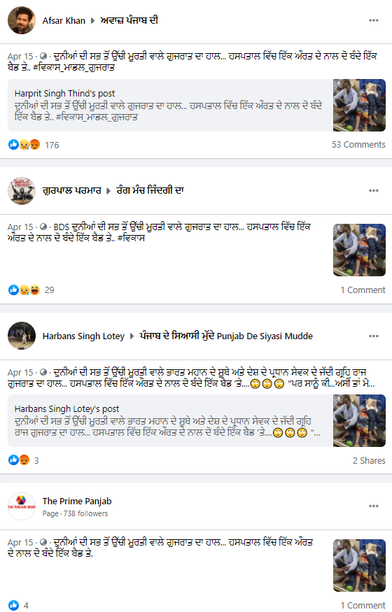 ਫੇਸਬੁੱਕ ਪੇਜ ਅੱਗ ਬਾਣੀ ਨੇ ਇਸ ਤਸਵੀਰ ਨੂੰ ਸ਼ੇਅਰ ਕਰਦੇ ਹੋਏ ਨਰਿੰਦਰ ਮੋਦੀ ਉੱਤੇ ਤੰਜ ਕਸਦਿਆਂ ਲਿਖਿਆ,”ਦੁਨੀਆ ਦੀ ਸਭ ਤੋਂ ਉੱਚੀ ਮੂਰਤੀ ਵਾਲੇ ਗੁਜਰਾਤ ਦਾ ਹਾਲਤ ਹਸਪਤਾਲ ਵਿਚ ਇਕ ਔਰਤ ਦੇ ਨਾਲ ਦੋ ਬੰਦੇ ਇੱਕ ਬੈੱਡ ਤੇ।” ਅਸੀਂ ਪਾਇਆ ਕਿ ਇਸ ਤਸਵੀਰ ਨੂੰ ਹੁਣ ਤਕ 134 ਤੋਂ ਵੱਧ ਲੋਕ ਸ਼ੇਅਰ ਕਰ ਚੁੱਕੇ ਹਨ।