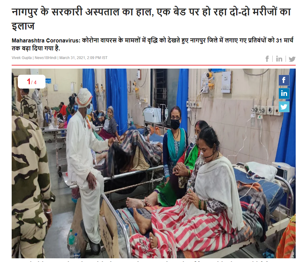 ਨਿਊਜ਼ 18 ਹਿੰਦੀ ਦੁਆਰਾ ਪ੍ਰਕਾਸ਼ਿਤ ਰਿਪੋਰਟ ਦੇ ਮੁਤਾਬਕ ਨਾਗਪੁਰ ਦੇ ਸਰਕਾਰੀ ਹਸਪਤਾਲ ਵਿਚ ਇਕ ਬੈੱਡ ਤੇ ਤਿੰਨ ਮਰੀਜ਼ਾਂ ਨੂੰ ਭਰਤੀ ਕਰ ਉਨ੍ਹਾਂ ਦਾ ਇਲਾਜ ਕੀਤਾ ਜਾ ਰਿਹਾ ਹੈ।