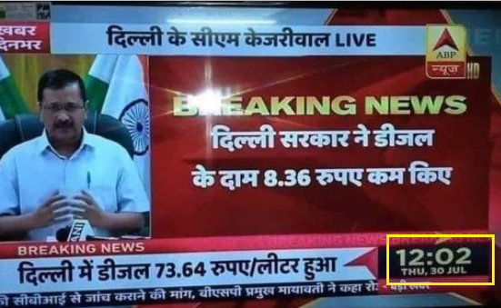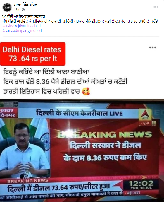 ਸੋਸ਼ਲ ਮੀਡੀਆ ‘ਤੇ ਏਬੀਪੀ ਨਿਊਜ਼ ਦੀ ਬ੍ਰੇਕਿੰਗ ਪਲੇਟ ਖੂਬ ਵਾਇਰਲ ਹੋ ਰਹੀ ਹੈ ਜਿਸ ਨਾਲ ਦਾਅਵਾ ਕੀਤਾ ਜਾ ਰਿਹਾ ਹੈ ਕਿ ਦਿੱਲੀ ਸਰਕਾਰ ਨੇ ਡੀਜ਼ਲ (Diesel) ਦੇ ਰੇਟ ਘਟਾ ਦਿੱਤੇ ਹਨ। ਬ੍ਰੈਕਿੰਗ ਪਲੇਟ ਅਨੁਸਾਰ ਡੀਜ਼ਲ ਦੇ ਰੇਟਾਂ ‘ਚ 8 ਰੁਪਏ ਅਤੇ 36 ਪੈਸੇ ਦਾ ਘਾਟਾ ਕੀਤਾ ਗਿਆ ਹੈ।