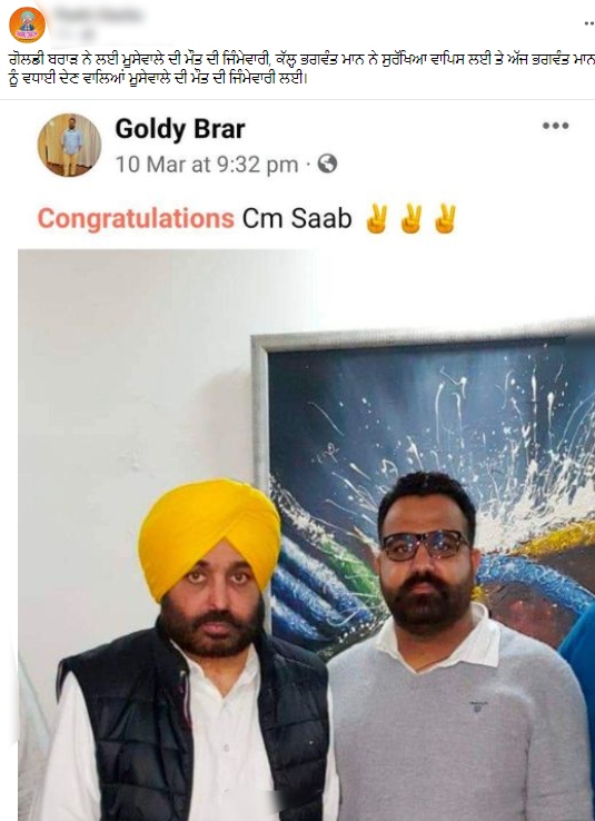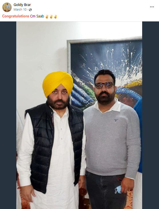 ਗੋਲਡੀ ਬਰਾੜ ਨੇ ਮੁੱਖ ਮੰਤਰੀ ਨਾਲ ਤਸਵੀਰ 10 ਮਾਰਚ 2022 ਨੂੰ ਆਮ ਆਦਮੀ ਪਾਰਟੀ ਦੀ ਵਿਧਾਨਸਭਾ ਚੋਣਾਂ ਵਿੱਚ ਜਿੱਤ ਤੋਂ ਬਾਅਦ ਅਪਲੋਡ ਕੀਤਾ ਸੀ।