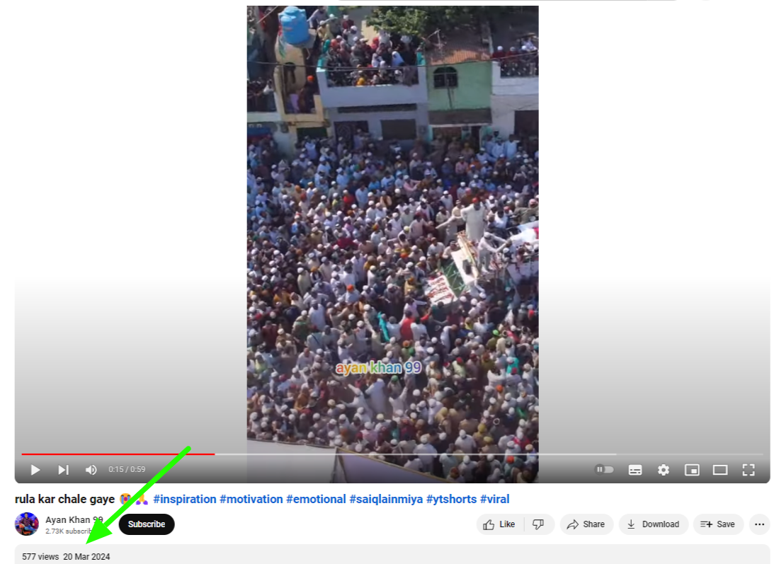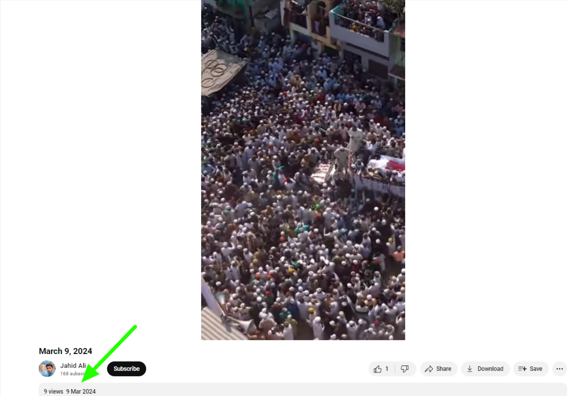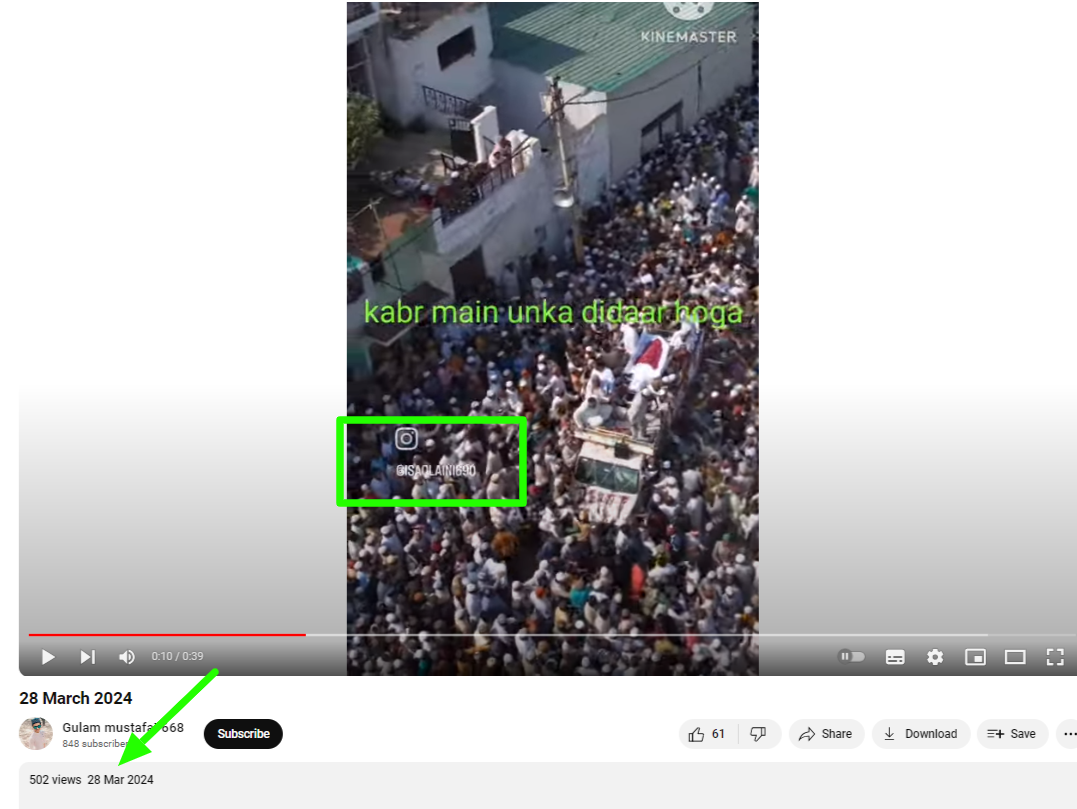 ਅਸੀਂ ਪਾਇਆ ਕਿ ਮੁਖਤਾਰ ਅੰਸਾਰੀ ਦੇ ਅੰਤਿਮ ਸੰਸਕਾਰ ਦੇ ਨਾਮ ਤੇ ਵਾਇਰਲ ਹੋ ਰਿਹਾ ਵੀਡੀਓ ਜਾਹਿਦ ਅਲੀ ਦੁਆਰਾ 9 ਮਾਰਚ, 2024 ਨੂੰ ਯੂਟਿਊਬ ‘ਤੇ ਸਾਂਝਾ ਕੀਤਾ ਗਿਆ ਸੀ।