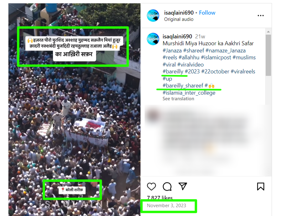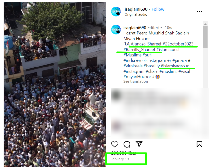 ਅਸੀਂ ਯੂਜ਼ਰ @isaqlaini690 ਦੇ ਇੰਸਟਾਗ੍ਰਾਮ ਅਕਾਊਂਟ ਨੂੰ ਖੰਗਾਲਿਆ। ਅਸੀਂ ਪਾਇਆ ਕਿ ਵਾਇਰਲ ਵੀਡੀਓ 19 ਜਨਵਰੀ, 2024 ਨੂੰ ਇਸ ਅਕਾਉਂਟ ‘ਤੇ ਪੋਸਟ ਕੀਤੀ ਗਈ ਸੀ। ਕੈਪਸ਼ਨ ਦੇ ਨਾਲ, “ਹਜ਼ਰਤ ਪੀਰੋ ਮੁਰਸ਼ਿਦ ਸ਼ਾਹ ਸਕਲੈਨ ਮੀਆਂ ਹਜ਼ੂਰ ਰਾ” ਲਿਖਿਆ ਹੋਇਆ ਸੀ।