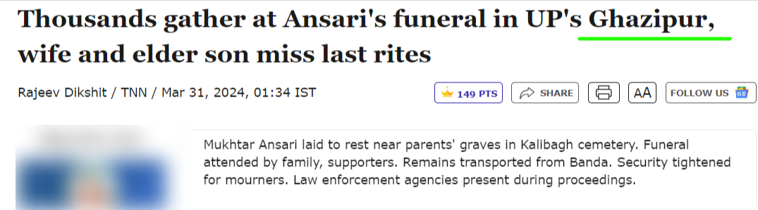 ਇਸ ਤਰ੍ਹਾਂ ਅਸੀਂ ਇਹ ਸਪਸ਼ਟ ਹੈ ਕਿ ਵਾਇਰਲ ਵੀਡੀਓ ਮੁਖਤਾਰ ਅੰਸਾਰੀ ਦੇ ਅੰਤਿਮ ਸੰਸਕਾਰ ਤੋਂ ਪਹਿਲਾਂ ਦੀ ਹੈ। ਇਸ ਤੋਂ ਇਲਾਵਾ ਇਹ ਵੀਡੀਓ ਬਰੇਲੀ ਦੀ ਹੈ ਨਾ ਕਿ ਗਾਜ਼ੀਪੁਰ ਜਿੱਥੇ ਅੰਸਾਰੀ ਦਾ ਅੰਤਿਮ ਸੰਸਕਾਰ ਹੋਇਆ ਸੀ।