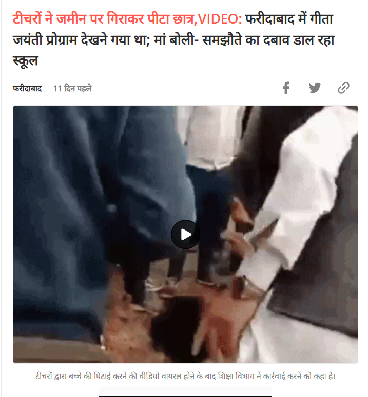 ਇਸ ਦੌਰਾਨ ਸਾਨੂੰ ਇੱਕ ਸਥਾਨਕ ਪੋਰਟਲ ‘ਤੇ ਪ੍ਰਕਾਸ਼ਿਤ ਇੱਕ ਰਿਪੋਰਟ ਮਿਲੀ । ਰਿਪੋਰਟ ‘ਚ ਫਰੀਦਾਬਾਦ ਪੁਲਿਸ ਦੇ ਬੁਲਾਰੇ ਸੂਬਾ ਸਿੰਘ ਦੇ ਹਵਾਲੇ ਨਾਲ ਦੱਸਿਆ ਗਿਆ ਹੈ ਕਿ ਬੱਚੇ ਦੀ ਸ਼ਿਕਾਇਤ ਅਤੇ ਬਿਆਨ ਲੈਣ ਤੋਂ ਬਾਅਦ ਅਧਿਆਪਕਾਂ ਖਿਲਾਫ ਜੁਵੇਨਾਈਲ ਐਕਟ ਅਤੇ ਆਈਪੀਸੀ ਦੀਆਂ ਵੱਖ-ਵੱਖ ਧਾਰਾਵਾਂ ਤਹਿਤ ਮਾਮਲਾ ਦਰਜ ਕਰ ਲਿਆ ਗਿਆ ਹੈ।