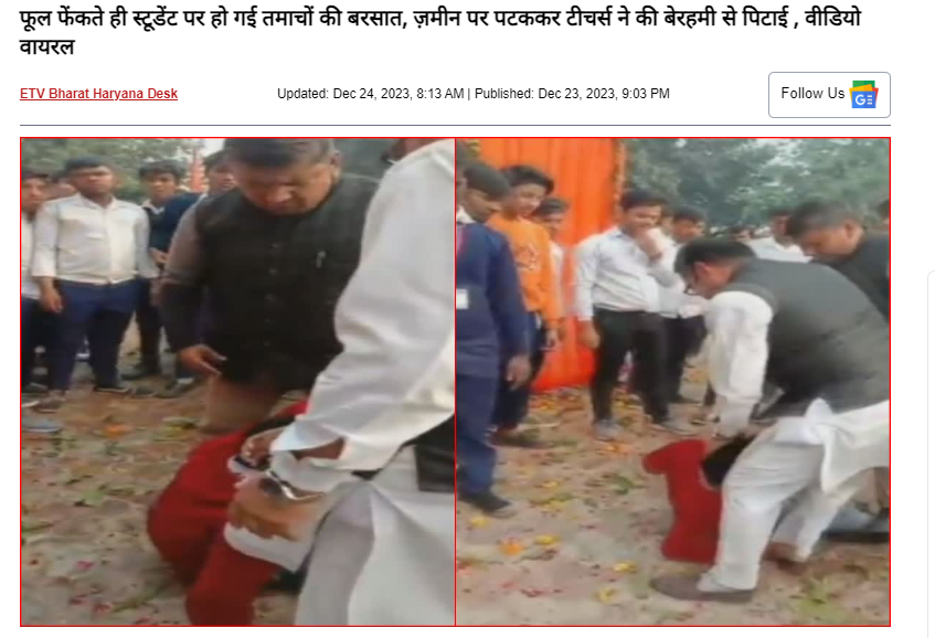 ਦੈਨਿਕ ਭਾਸਕਰ ਦੀ ਰਿਪੋਰਟ ਮੁਤਾਬਕ 22 ਦਸੰਬਰ 2023 ਨੂੰ ਰਾਜੀਵ ਕਲੋਨੀ, ਫਰੀਦਾਬਾਦ ਦੇ ਰਹਿਣ ਵਾਲੇ ਅਤੇ ਸਰਕਾਰੀ ਸੀਨੀਅਰ ਸੈਕੰਡਰੀ ਸਕੂਲ, ਗਾਉਂਚੀ ਵਿੱਚ ਪੜ੍ਹਦਾ ਇੱਕ ਵਿਦਿਆਰਥੀ ਗੀਤਾ ਜੈਅੰਤੀ ਦਾ ਪ੍ਰੋਗਰਾਮ ਦੇਖਣ ਗਿਆ ਸੀ। ਇਸ ਦੌਰਾਨ ਉਸ ਨਾਲ ਸਕੂਲ ਦੇ ਹੋਰ ਵਿਦਿਆਰਥੀ ਵੀ ਮੌਜੂਦ ਸਨ ਅਤੇ ਇਸ ਦੌਰਾਨ ਸਕੂਲ ਦੇ ਦੋ ਅਧਿਆਪਕਾਂ ਰਵੀ ਮੋਹਨ ਅਤੇ ਕਮਲ ਨੇ ਵਿਦਿਆਰਥੀ ‘ਤੇ ਲੜਕੀਆਂ ‘ਤੇ ਫੁੱਲ ਸੁੱਟਣ ਦਾ ਦੋਸ਼ ਲਗਾਇਆ ਅਤੇ ਉਸ ਦੀ ਬੇਰਹਿਮੀ ਨਾਲ ਕੁੱਟਮਾਰ ਕੀਤੀ।