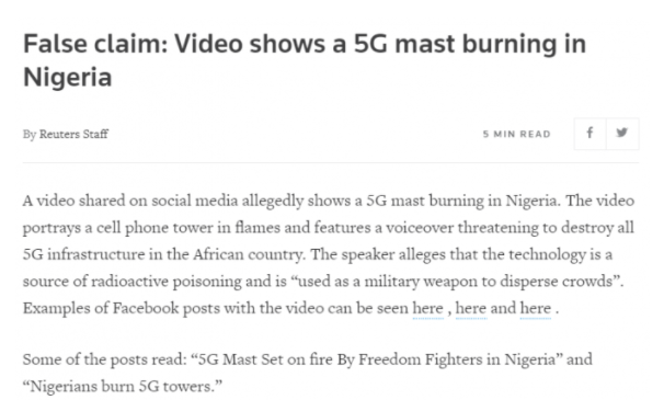 ਭਾਰਤ ਵਿਚ ਕੋਰੋਨਾਵਾਇਰਸ ਮਾਹਾਵਾਰੀ ਦੇ ਦੌਰਾਨ 5ਜੀ ਟਾਵਰਾਂ ਨੂੰ ਲੈ ਕੇ ਕਈ ਤਰ੍ਹਾਂ ਦੀਆਂ ਗੁੰਮਰਾਹਕੁੰਨ ਜਾਣਕਾਰੀ ਸ਼ੇਅਰ ਕੀਤੀਆਂ ਜਾ ਰਹੀਆਂ ਹਨ। ਇਸ ਤੋਂ ਪਹਿਲਾਂ ਦਾਅਵਾ ਕੀਤਾ ਜਾ ਰਿਹਾ ਸੀ ਕਿ 5ਜੀ ਟਾਵਰਾਂ ਦੇ ਕਾਰਨ ਫੈਲ ਰਹੀ ਬਿਮਾਰੀ ਨੂੰ ਕੋਰੋਨਾ ਦਾ ਨਾਮ ਦਿੱਤਾ ਜਾ ਰਿਹਾ ਹੈ ਇਸ ਦਾਮਨ ਲੈ ਕੇ ਤੁਸੀਂ Newschecker ਦਾ ਫੈਕਟ ਚੈੱਕ ਇੱਥੇ ਕਲਿੱਕ ਕਰਕੇ ਪੜ੍ਹ ਸਕਦੇ ਹੋ।