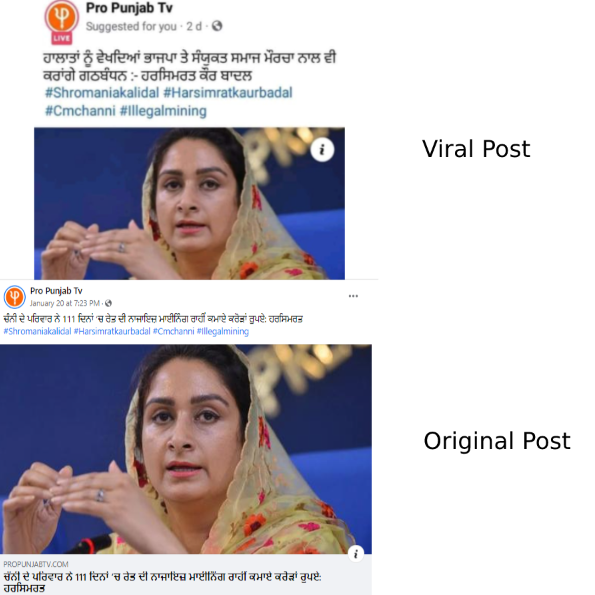 ਅਸੀਂ ਪਾਇਆ ਕਿ ਪ੍ਰੋ ਪੰਜਾਬ ਟੀ ਵੀ ਦੁਆਰਾ 20 ਜਨਵਰੀ ਨੂੰ ਅਪਲੋਡ ਕੀਤੀ ਗਈ ਪੋਸਟ ਅਤੇ ਵਾਇਰਲ ਪੋਸਟ ਦੇ ਵਿੱਚ ਹੈਸ਼ਟੈਗ ਤੇ ਹਰਸਿਮਰਤ ਕੌਰ ਬਾਦਲ ਦੀ ਤਸਵੀਰ ਇਕ ਸਮਾਨ ਹੈ ਪਰ ਕੈਪਸ਼ਨ ਅਲਗ ਹੈ। ਤੁਸੀਂ ਨੀਚੇ ਤਸਵੀਰ ਵਿੱਚ ਵਾਇਰਲ ਹੋ ਰਹੀ ਪੋਸਟ ਅਤੇ ਅਸਲ ਪੋਸਟ ਵਿੱਚ ਅੰਤਰ ਦੇਖ ਸਕਦੇ ਹੋ।