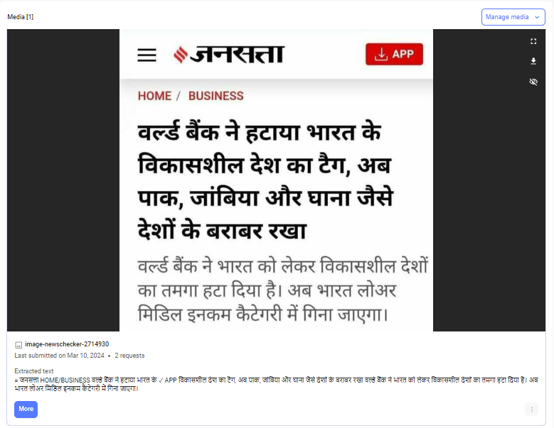 ਵਾਇਰਲ ਦਾਅਵੇ ਦੀ ਜਾਂਚ ਲਈ ਅਸੀਂ ਸਭ ਤੋਂ ਪਹਿਲਾਂ ਗੂਗਲ ‘ਤੇ ਕੀ ਵਰਡ ਦੀ ਮਦਦ ਨਾਲ ਜਨਸੱਤਾ ਦੀ ਇਸ ਖਬਰ ਨੂੰ ਸਰਚ ਕੀਤਾ। ਅਸੀਂ ਪਾਇਆ ਕਿ ਇਹ ਖ਼ਬਰ ਪੁਰਾਣੀ ਹੈ। ਇਹ ਖ਼ਬਰ 5 ਜੂਨ 2016 ਨੂੰ ਜਨਸੱਤਾ ਨੇ ਪ੍ਰਕਾਸ਼ਿਤ ਕੀਤੀ ਸੀ । ਖਬਰ ਮੁਤਾਬਕ ਉਸ ਸਮੇਂ ਵਿਸ਼ਵ ਬੈਂਕ ਨੇ ਅਰਥਵਿਵਸਥਾ ਦੀ ਵੰਡ ਦੀਆਂ ਸ਼੍ਰੇਣੀਆਂ ਦੇ ਨਾਂ ਬਦਲ ਦਿੱਤੇ ਸਨ। ਪਹਿਲਾਂ ਘੱਟ ਅਤੇ ਮੱਧ ਆਮਦਨ ਵਾਲੇ ਦੇਸ਼ਾਂ ਨੂੰ ‘ਵਿਕਾਸਸ਼ੀਲ’ ਅਤੇ ਉੱਚ ਆਮਦਨ ਵਾਲੇ ਦੇਸ਼ਾਂ ਨੂੰ ‘ਵਿਕਸਿਤ’ ਦੇਸ਼ ਮੰਨਿਆ ਜਾਂਦਾ ਸੀ। ਇਸ ਤਰ੍ਹਾਂ ਵਿਸ਼ਵ ਬੈਂਕ ‘ਵਿਕਾਸਸ਼ੀਲ’ ਦੇਸ਼ਾਂ ਵਿਚ ਭਾਰਤ ਦਾ ਜ਼ਿਕਰ ਕਰਦਾ ਸੀ। ਇਸ ਤੋਂ ਬਾਅਦ ਸਾਲ 2016 ‘ਚ ਵਿਸ਼ਵ ਬੈਂਕ ਨੇ ਪ੍ਰਤੀ ਵਿਅਕਤੀ ਆਮਦਨ ਦੇ ਆਧਾਰ ‘ਤੇ ਦੇਸ਼ਾਂ ਦਾ ਜ਼ਿਕਰ ਕਰਨਾ ਸ਼ੁਰੂ ਕੀਤਾ, ਸ਼੍ਰੇਣੀਆਂ ਦੇ ਨਾਂ ਬਦਲਣ ਤੋਂ ਬਾਅਦ ਭਾਰਤ ਨੂੰ ਨਿਮਨ-ਮੱਧ ਆਮਦਨ ਵਾਲਾ ਦੇਸ਼ ਜਾਂ ਅਰਥਵਿਵਸਥਾ ਕਿਹਾ ਜਾਣ ਲੱਗਾ।