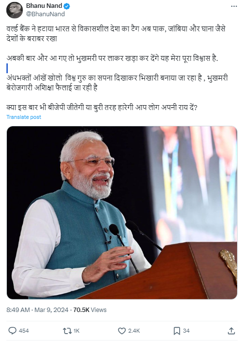9 ਮਾਰਚ, 2024 ਨੂੰ ਐਕਸ ਤੇ ਸ਼ੇਅਰ ਕੀਤੀ ਗਈ ਪੋਸਟ ਵਿੱਚ ਲਿਖਿਆ ਹੈਮ,”ਜੇਕਰ ਉਹ ਇਸ ਵਾਰ ਫਿਰ ਆਉਂਦੇ ਹਨ ਤਾਂ ਮੈਨੂੰ ਪੂਰਾ ਵਿਸ਼ਵਾਸ ਹੈ ਕਿ ਉਹ ਤੁਹਾਨੂੰ ਭੁੱਖਮਰੀ ਦੇ ਮੁਕਾਮ ਤੱਕ ਪਹੁੰਚਾ ਦੇਣਗੇ। ਅੰਧਭਕਤੋ ਅੱਖਾਂ ਖੋਲ੍ਹੋ। ਵਿਸ਼ਵ ਗੁਰੂ ਦੇ ਸੁਪਨੇ ਦਿਖਾ ਕੇ ਉਨ੍ਹਾਂ ਨੂੰ ਭਿਖਾਰੀ ਬਣਾਇਆ ਜਾ ਰਿਹਾ ਹੈ। ਭੁੱਖਮਰੀ,ਬੇਰੁਜ਼ਗਾਰੀ ਅਤੇ ਅਨਪੜ੍ਹਤਾ ਫੈਲਾਈ ਜਾ ਰਹੀ ਹੈ। ਕੀ ਇਸ ਵਾਰ ਵੀ ਬੀਜੇਪੀ ਜਿੱਤੇਗੀ ਜਾਂ ਬੁਰੀ ਤਰ੍ਹਾਂ ਹਾਰੇਗੀ। ਤੁਸੀਂ ਆਪਣੇ ਵਿਚਾਰ ਦਿਓ।”