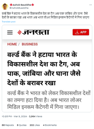 ਸੋਸ਼ਲ ਮੀਡੀਆ ‘ਤੇ ਇੱਕ ਦਾਅਵਾ ਵਾਇਰਲ ਹੋ ਰਿਹਾ ਹੈ ਜਿਸ ਮੁਤਾਬਕ ਵਿਸ਼ਵ ਬੈਂਕ ਨੇ ਭਾਰਤ ਤੋਂ ਵਿਕਾਸਸ਼ੀਲ ਦੇਸ਼ ਦਾ ਟੈਗ ਹਟਾ ਕੇ ਭਾਰਤ ਨੂੰ ਪਾਕਿਸਤਾਨ, ਜ਼ੈਂਬੀਆ ਅਤੇ ਘਾਨਾ ਵਰਗੇ ਦੇਸ਼ਾਂ ਦੇ ਬਰਾਬਰ ਰੱਖ ਦਿੱਤਾ ਹੈ।
