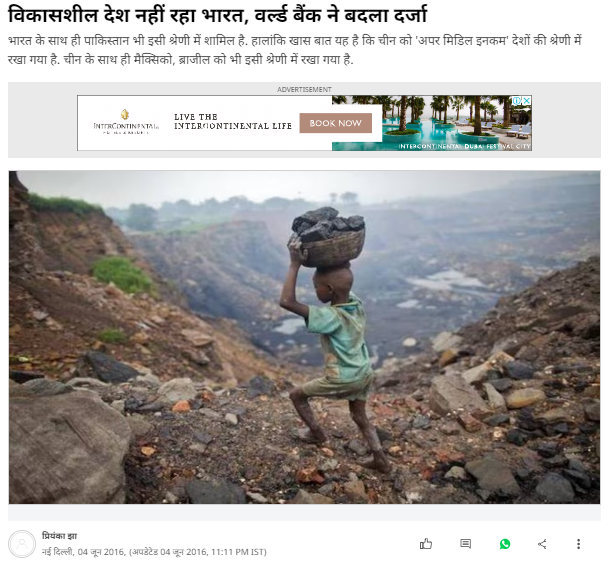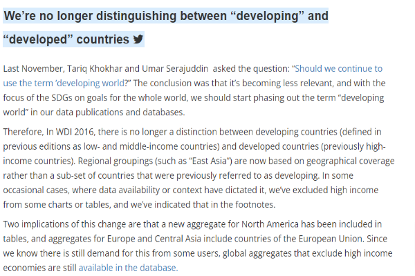 ਇਸ ਤੋਂ ਬਾਅਦ, ਵਿਸ਼ਵ ਬੈਂਕ ਦੁਆਰਾ ਜਾਰੀ ਕੀਤੇ ਗਏ ‘ਵਰਲਡ ਡਿਵੈਲਪਮੈਂਟ ਇੰਡੀਕੇਟਰਜ਼’ ਦੇ 2016 ਦੇ ਐਡੀਸ਼ਨ ਵਿੱਚ ਦੇਸ਼ਾਂ ਨੂੰ ‘ਵਿਕਾਸਸ਼ੀਲ’ ਜਾਂ ‘ਵਿਕਸਿਤ’ ਸ਼ਬਦਾਂ ਨਾਲ ਨਹੀਂ ਦਰਸਾਇਆ ਗਿਆ ਸੀ। ਵਿਸ਼ਵ ਬੈਂਕ ਨੇ ਵੀ ਇੱਕ ਬਲਾਗ ਰਾਹੀਂ ਇਹ ਜਾਣਕਾਰੀ ਦਿੱਤੀ ਸੀ।