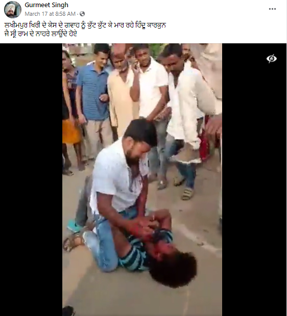 ਫੇਸਬੁੱਕ ਯੂਜ਼ਰ ‘ਗੁਰਮੀਤ ਸਿੰਘ’ ਨੇ ਵਾਇਰਲ ਵੀਡੀਓ ਨੂੰ ਸ਼ੇਅਰ ਕਰਦਿਆਂ ਲਿਖਿਆ,’ਲਖੀਮਪੁਰ ਖੇੜੀ ਦੇ ਕੇਸ ਦੇ ਗਵਾਹ ਨੂੰ ਕੁੱਟ ਕੁੱਟ ਕੇ ਮਾਰ ਰਹੀ ਹਿੰਦੂ ਕਾਰਕੁਨ।’