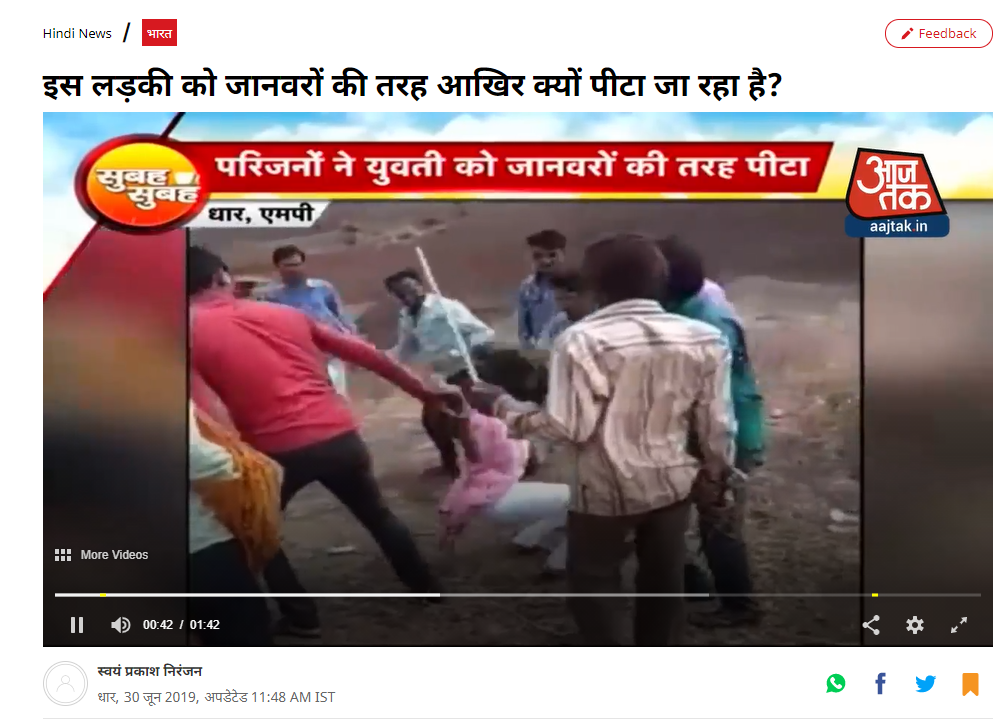 ਐਨਡੀਟੀਵੀ ਦੁਆਰਾ 30 ਜੂਨ 2019 ਨੂੰ ਪ੍ਰਕਾਸ਼ਿਤ ਲੇਖ ਦੇ ਵਿਚ ਲੜਕੀ ਦੀ ਬੇਰਹਿਮੀ ਨਾਲ ਹੋਈ ਕੁੱਟਮਾਰ ਦੀ ਘਟਨਾ ਨੂੰ ਮੱਧ ਪ੍ਰਦੇਸ਼ ਦੇ ਧਾਰ ਜ਼ਿਲ੍ਹੇ ਦਾ ਦੱਸਿਆ ਗਿਆ ਹੈ ਇਸ ਦੇ ਨਾਲ ਹੀ ਘਟਨਾ ਦੇ ਬਾਰੇ ਵਿਚ ਜਾਣਕਾਰੀ ਦਿੰਦੇ ਹੋਏ ਐੱਨਡੀਟੀਵੀ ਨੇ ਲੇਖ ਵਿੱਚ ਦੱਸਿਆ ਕਿ ਬਿਲਾਲਾ ਜਨਜਾਤੀ ਦੀ ਇੱਕ ਲੜਕੀ ਇਕ ਦਲਿਤ ਲੜਕੇ ਨਾਲ ਘਰੋਂ ਭੱਜ ਗਈ ਸੀ। ਜਦਕਿ ਲੜਕੀ ਦੇ ਪਰਿਵਾਰ ਵਾਲੇ ਚਾਹੁੰਦੇ ਸਨ ਕਿ ਉਨ੍ਹਾਂ ਦੀ ਲੜਕੀ ਬਿਲਾਲਾ ਜਨਜਾਤੀ ਦੇ ਮੁੰਡੇ ਨਾਲ ਵਿਆਹ ਕਰਵਾਵੇ।