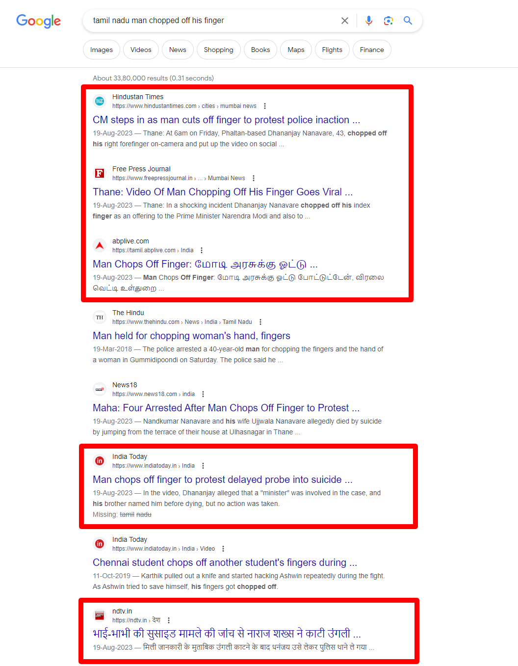 ਅਸੀਂ ਦਾਅਵੇ ਵਿਚਲੀ ਜਾਣਕਾਰੀ ਦੇ ਆਧਾਰ ‘ਤੇ ਗੂਗਲ ਸਰਚ ਕੀਤਾ। ਇਸ ਦੌਰਾਨ, ਸਾਨੂੰ ਕਈ ਮੀਡੀਆ ਰਿਪੋਰਟਾਂ ਮਿਲੀਆਂ ਜਿਸ ਮੁਤਾਬਕ ਇਸ ਮਾਮਲੇ ਵਿੱਚ ਵਿਅਕਤੀ ਦੁਆਰਾ ਆਪਣੇ ਭਰਾ ਅਤੇ ਉਸਦੀ ਪਤਨੀ ਨੂੰ ਕਤਲ ਕਰਨ ਲਈ ਮਜਬੂਰ ਕਰਨ ਵਾਲਿਆਂ ਵਿਰੁੱਧ ਤੁਰੰਤ ਕਾਰਵਾਈ ਨਾ ਕਰਨ ਲਈ ਆਪਣੀ ਉਂਗਲ ਵੱਢ ਕੇ ਰੋਸ ਦਰਸਾਇਆ।