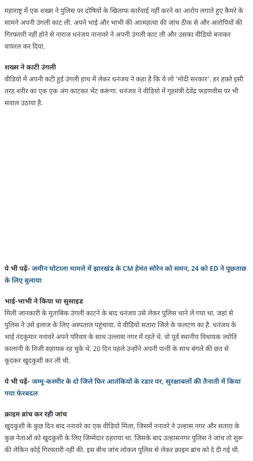 ਮਹਾਰਾਸ਼ਟਰ ਦੇ ਸਤਾਰਾ ‘ਚ ਇਕ ਵਿਅਕਤੀ ਨੇ ਆਪਣੇ ਭਰਾ ਅਤੇ ਭਰਜਾਈ ਨੂੰ ਖੁਦਕੁਸ਼ੀ ਲਈ ਮਜਬੂਰ ਕਰਨ ਵਾਲਿਆਂ ਖਿਲਾਫ ਸਖਤ ਕਾਰਵਾਈ ਨਾ ਹੋਣ ਕਾਰਨ ਆਪਣੀ ਉਂਗਲ ਵੱਢ ਲਈ।