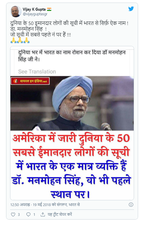 ਸੋਸ਼ਲ ਮੀਡੀਆ ਤੇ ਸਾਬਕਾ ਪ੍ਰਧਾਨ ਮੰਤਰੀ ਡਾ ਮਨਮੋਹਨ ਸਿੰਘ (Dr. Manmohan Singh) ਦੀ ਇੱਕ ਤਸਵੀਰ ਦੇ ਨਾਲ ਦਾਅਵਾ ਕੀਤਾ ਜਾ ਰਿਹਾ ਹੈ ਕਿ ਅਮਰੀਕਾ ਵਿੱਚ ਜਾਰੀ ਦੁਨੀਆਂ ਦੇ 50 ਸਭ ਤੋਂ ਇਮਾਨਦਾਰ ਲੋਕਾਂ ਦੀ ਸੂਚੀ ਦੇ ਵਿੱਚ ਭਾਰਤ ਦਾ ਇੱਕ ਵਿਅਕਤੀ ਹੈ। ਡਾ ਮਨਮੋਹਨ ਸਿੰਘ ਇਸ ਸੂਚੀ ਵਿੱਚ ਸਭ ਤੋਂ ਪਹਿਲੇ ਸਥਾਨ ਤੇ ਹਨ।