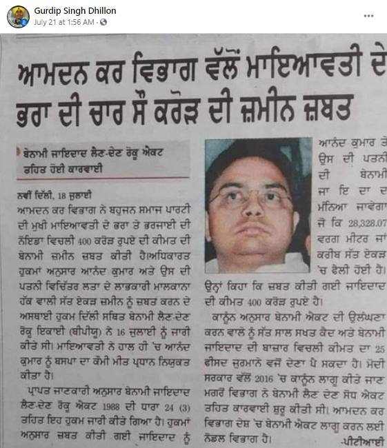ਪੰਜਾਬੀ ਟ੍ਰਿਬਿਊਨ ਦੁਆਰਾ ਪ੍ਰਕਾਸ਼ਿਤ ਰਿਪੋਰਟ ਮੁਤਾਬਕ, “ਆਮਦਨ ਕਰ ਵਿਭਾਗ ਨੇ ਬਹੁਜਨ ਸਮਾਜ ਪਾਰਟੀ ਦੀ ਮੁਖੀ ਮਾਇਆਵਤੀ ਦੇ ਭਰਾ ਤੇ ਭਰਜਾਈ ਦੀ ਨੋਇਡਾ ਵਿਚਲੀ 400 ਕਰੋੜ ਰੁਪਏ ਦੀ ਕੀਮਤ ਦੀ ਬੇਨਾਮੀ ਜ਼ਮੀਨ ਜ਼ਬਤ ਕੀਤੀ ਹੈ। ਅਧਿਕਾਰਤ ਹੁਕਮਾਂ ਅਨੁਸਾਰ ਆਨੰਦ ਕੁਮਾਰ ਅਤੇ ਉਸ ਦੀ ਪਤਨੀ ਵਿਚਿੱਤਰ ਲਤਾ ਦੇ ਲਾਭਕਾਰੀ ਮਾਲਕਾਨਾ ਹੱਕ ਵਾਲੀ ਸੱਤ ਏਕੜ ਜ਼ਮੀਨ ਨੂੰ ਜ਼ਬਤ ਕਰਨ ਦੇ ਅਸਥਾਈ ਹੁਕਮ ਦਿੱਲੀ ਸਥਿਤ ਬੇਨਾਮੀ ਲੈਣ-ਦੇਣ ਰੋਕੂ ਇਕਾਈ (ਬੀਪੀਯੂ) ਨੇ 16 ਜੁਲਾਈ ਨੂੰ ਜਾਰੀ ਕੀਤੇ ਸੀ। ਮਾਇਆਵਤੀ ਨੇ ਹਾਲ ਹੀ ’ਚ ਆਨੰਦ ਕੁਮਾਰ ਨੂੰ ਬਸਪਾ ਦਾ ਕੌਮੀ ਮੀਤ ਪ੍ਰਧਾਨ ਨਿਯੁਕਤ ਕੀਤਾ ਹੈ। ਪ੍ਰਾਪਤ ਜਾਣਕਾਰੀ ਅਨੁਸਾਰ ਬੇਨਾਮੀ ਜਾਇਦਾਦ ਲੈਣ-ਦੇਣ ਰੋਕੂ ਐਕਟ 1988 ਦੀ ਧਾਰਾ 24 (3) ਤਹਿਤ ਇਹ ਹੁਕਮ ਜਾਰੀ ਕੀਤੇ ਗਿਆ ਹੈ।
