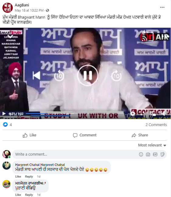 ਫੇਸਬੁਕ ਪੇਜ ‘ਅਗ ਬਾਣੀ’ ਨੇ ਵਾਇਰਲ ਵੀਡੀਓ ਨੂੰ ਸ਼ੇਅਰ ਕਰਦਿਆਂ ਲਿਖਿਆ,’ਮੁੱਖ ਮੰਤਰੀ ਭਗਵੰਤ ਮਾਨ ਨੂੰ ਸਿੱਧਾ ਹੋਇਆ ਆਪ ਦਾ ਸਿੱਖਿਆ ਮੰਤਰੀ ਮਿਥਿਆ। ਪਟਵਾਰੀ ਵਾਲੇ ਮੁੱਦੇ ਤੇ ਕੀਤੀ ਪ੍ਰੈੱਸ ਕਾਨਫਰੰਸ।’