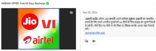 ਸਾਨੂੰ ਇਹ ਦਾਅਵਾ WhatsApp ਟਿਪ ਲਾਈਨ ( 9999499044 ) ‘ਤੇ ਵੀ ਪ੍ਰਾਪਤ ਹੋਇਆ। ਵਟਸਐਪ ‘ਤੇ ਵਾਇਰਲ ਹੋ ਰਹੇ ਮੈਸਜ ‘ਚ ਦਾਅਵਾ ਕੀਤਾ ਜਾ ਰਿਹਾ ਹੈ ਕਿ ਜੀਓ ਕੰਪਨੀ ਆਪਣੇ ਮਾਲਕ ਮੁਕੇਸ਼ ਅੰਬਾਨੀ ਦਾ ਜਨਮਦਿਨ ਮਨਾਉਣ ਲਈ ਸਾਰੇ ਭਾਰਤੀ ਗ੍ਰਾਹਕਾਂ ਨੂੰ 84 ਦਿਨਾਂ ਲਈ 555 ਰੁਪਏ ਦਾ ਮੁਫਤ ਰਿਚਾਰਜ ਦੇ ਰਹੀ ਹੈ।