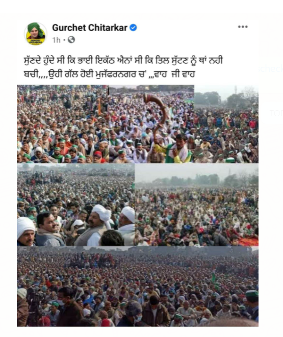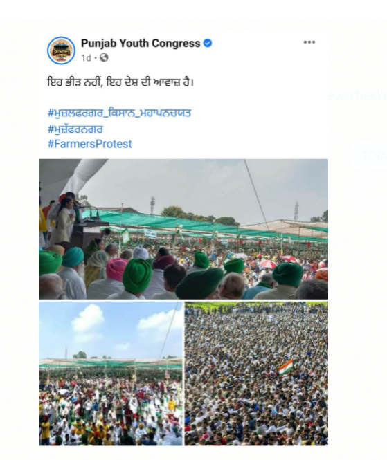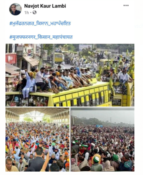 ਸੋਸ਼ਲ ਮੀਡਿਆ ਤੇ ਵਾਇਰਲ ਹੋ ਰਹੀ ਪਹਿਲੀ ਤਸਵੀਰ ਦੇ ਵਿੱਚ ਵਿਚ ਹਜਾਰਾਂ ਦੇ ਇਕੱਠ ਨੂੰ ਵੇਖਿਆ ਜਾ ਸਕਦਾ ਹੈ ਜਦਕਿ ਦੂਜੀ ਤਸਵੀਰ ਦੇ ਵਿੱਚ ਬੱਸ ਦੀ ਛੱਤ ਤੇ ਵੱਡੀ ਗਿਣਤੀ ‘ਚ ਬੈਠੇ ਲੋਕਾਂ ਨੂੰ ਦੇਖਿਆ ਜਾ ਸਕਦਾ ਹੈ। ਤੀਜੀ ਤਸਵੀਰ ਦੇ ਵਿੱਚ ਵੀ ਵੱਡੀ ਤਾਦਾਦ ਦੇ ਵਿੱਚ ਲੋਕਾਂ ਦੀ ਭੀੜ ਨੂੰ ਦੇਖਿਆ ਜਾ ਸਕਦਾ ਹੈ। ਵਾਇਰਲ ਹੋ ਰਹੀ ਤਸਵੀਰਾਂ ਦੇ ਨਾਲ ਦਾਅਵਾ ਕੀਤਾ ਜਾ ਰਿਹਾ ਹੈ ਕਿ ਇਹ ਤਸਵੀਰ ਮੁਜ਼ੱਫਰਨਗਰ ‘ਚ ਹੋਈ ਮਹਾਪੰਚਾਇਤ ਦੀ ਹੈ।